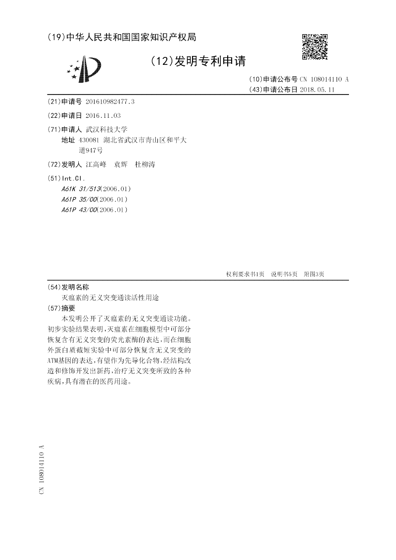 本发明公开了灭瘟素的无义突变通读功能。初步实验结果表明,灭瘟素在细胞模型中可部分恢复含有无义突变的荧光素酶的表达,而在细胞外蛋白质截短实验中可部分恢复含无义突变的ATM基因的表达,有望作为先导化合物,经结构改造和修饰开发出新药,治疗无义突变所致的各种疾病,具有潜在的医药用途。