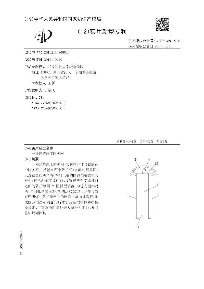 一种建筑施工防护网,其包括并排设置的两个防护栏1、设置在两个防护栏1之间的尼龙网2以及设置在两个防护栏1上端的圆弧型端盖3;防护栏1包括两个支撑柱11、设置在两个支撑柱11之间的防护钢网12;圆弧型端盖3为透光塑料材质;与圆弧型端盖3相邻的连接架13上并排设置有照明灯4;防护钢网12的网面上部向外弯折,形成圆弧型凸起网面121;本实用新型整体防护性能稳定,可有效的阻隔外来人员进入工地,并且整体规划性强。