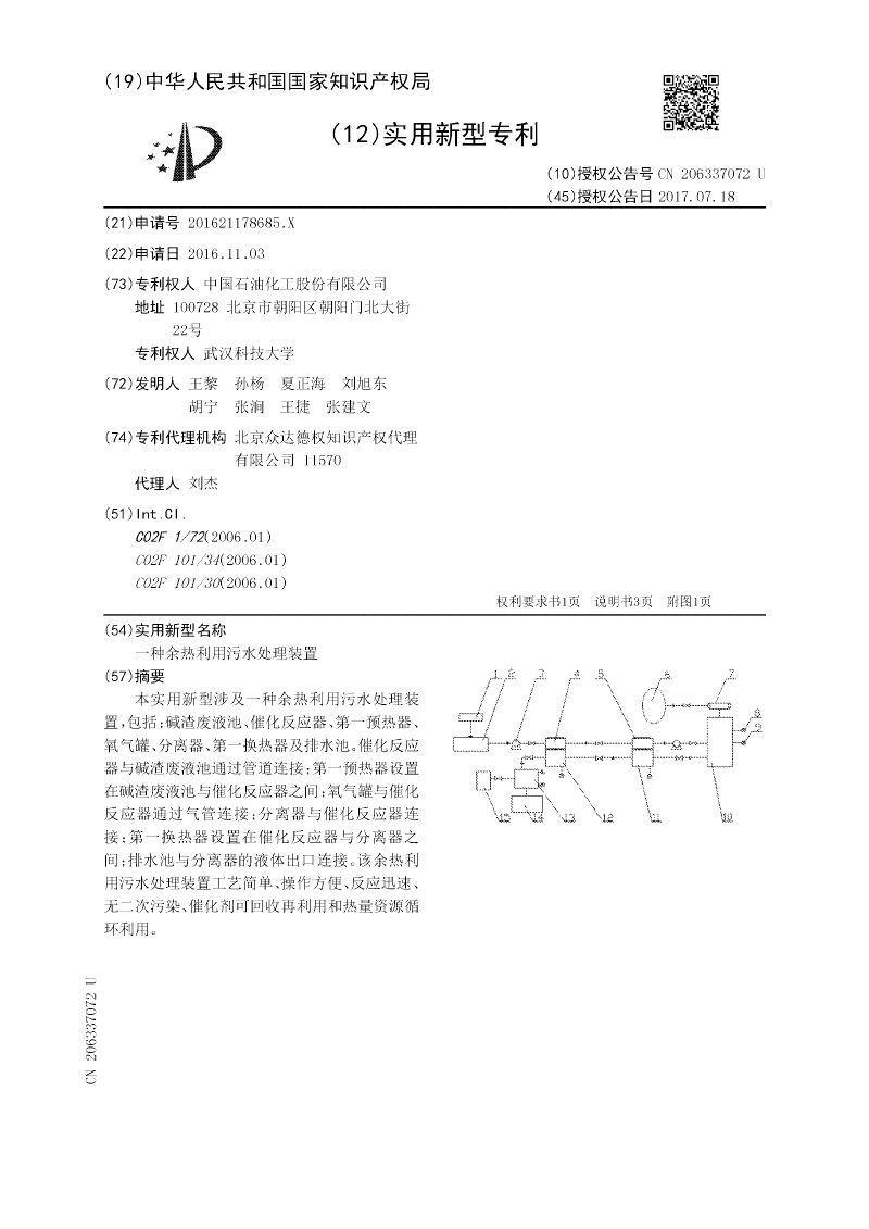 本实用新型涉及一种余热利用污水处理装置,包括:碱渣废液池、催化反应器、第一预热器、氧气罐、分离器、第一换热器及排水池。催化反应器与碱渣废液池通过管道连接;第一预热器设置在碱渣废液池与催化反应器之间;氧气罐与催化反应器通过气管连接;分离器与催化反应器连接;第一换热器设置在催化反应器与分离器之间;排水池与分离器的液体出口连接。该余热利用污水处理装置工艺简单、操作方便、反应迅速、无二次污染、催化剂可回收再利用和热量资源循环利用。