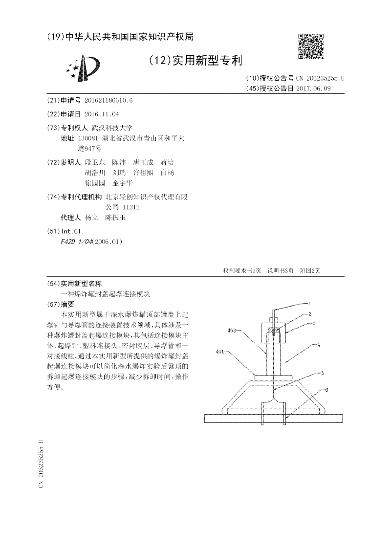 本实用新型属于深水爆炸罐顶部罐盖上起爆针与导爆管的连接装置技术领域,具体涉及一种爆炸罐封盖起爆连接模块,其包括连接模块主体、起爆针、塑料连接头、密封胶层、导爆管和一对接线柱。通过本实用新型所提供的爆炸罐封盖起爆连接模块可以简化深水爆炸实验后繁琐的拆卸起爆连接模块的步骤,减少拆卸时间,操作方便。
