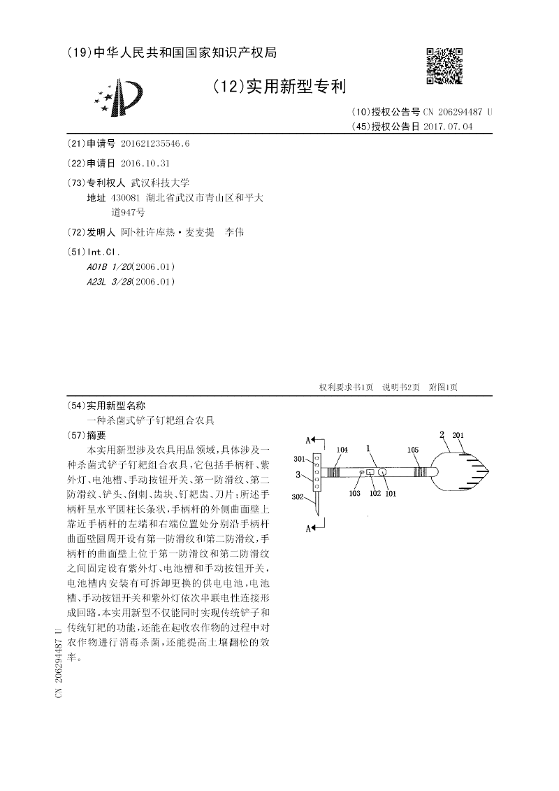 本实用新型涉及农具用品领域,具体涉及一种杀菌式铲子钉耙组合农具,它包括手柄杆、紫外灯、电池槽、手动按钮开关、第一防滑纹、第二防滑纹、铲头、倒刺、齿块、钉耙齿、刀片;所述手柄杆呈水平圆柱长条状,手柄杆的外侧曲面壁上靠近手柄杆的左端和右端位置处分别沿手柄杆曲面壁圆周开设有第一防滑纹和第二防滑纹,手柄杆的曲面壁上位于第一防滑纹和第二防滑纹之间固定设有紫外灯、电池槽和手动按钮开关,电池槽内安装有可拆卸更换的供电电池,电池槽、手动按钮开关和紫外灯依次串联电性连接形成回路。本实用新型不仅能同时实现传统铲子和传统钉耙的功能,还能在起收农作物的过程中对农作物进行消毒杀菌,还能提高土壤翻松的效率。