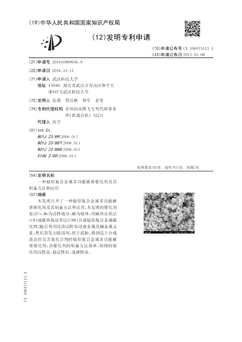 本发明公开了一种钴钼复合金属多功能碳基催化剂及其制备方法和应用,本发明的催化剂是以Co、Mo为活性成分,碳为载体,用碳热还原法(CR)或碳热氢还原法(CHR)合成钴钼复合金属碳化物,随后利用浸渍法附加过渡金属及碱金属元素,然后蒸发去除溶剂,烘干造粒,得到适于合成液态烃及含氧化合物的钴钼复合金属多功能碳基催化剂,该催化剂的制备方法简单,制得的催化剂活性高、稳定性好、选择性高。