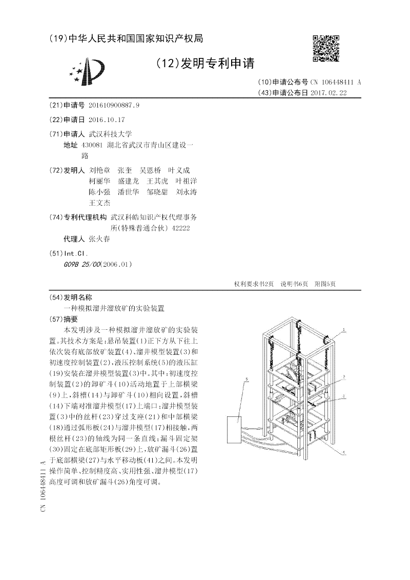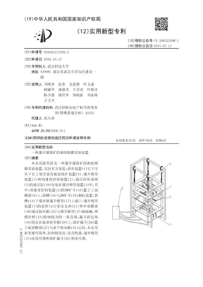 本实用新型涉及一种溜井溜放矿的相似模拟实验装置。其技术方案是:悬吊装置(1)正下方从下往上依次装有底部放矿装置(4)、溜井模型装置(3)和初速度控制装置(2),液压控制系统(5)的液压缸(19)安装在溜井模型装置(3)中。其中:初速度控制装置(2)的卸矿斗(10)置于上部横梁(9)上,斜槽(14)与卸矿斗(10)相向设置,斜槽(14)下端对准溜井模型(17)上端口;溜井模型装置(3)的丝杆(23)穿过支座(21)和中部横梁(18)通过弧形板(24)与溜井模型(17)相接触,两根丝杆(23)的轴线为同一条直线;漏斗固定架(30)固定在底部矩形板(29)上,放矿漏斗(26)置于底部横梁(27)与水平移动板(41)之间。本实用新型操作简单、控制精度高、实用性强、溜井模型(17)高度可调和放矿漏斗(26)角度可调。