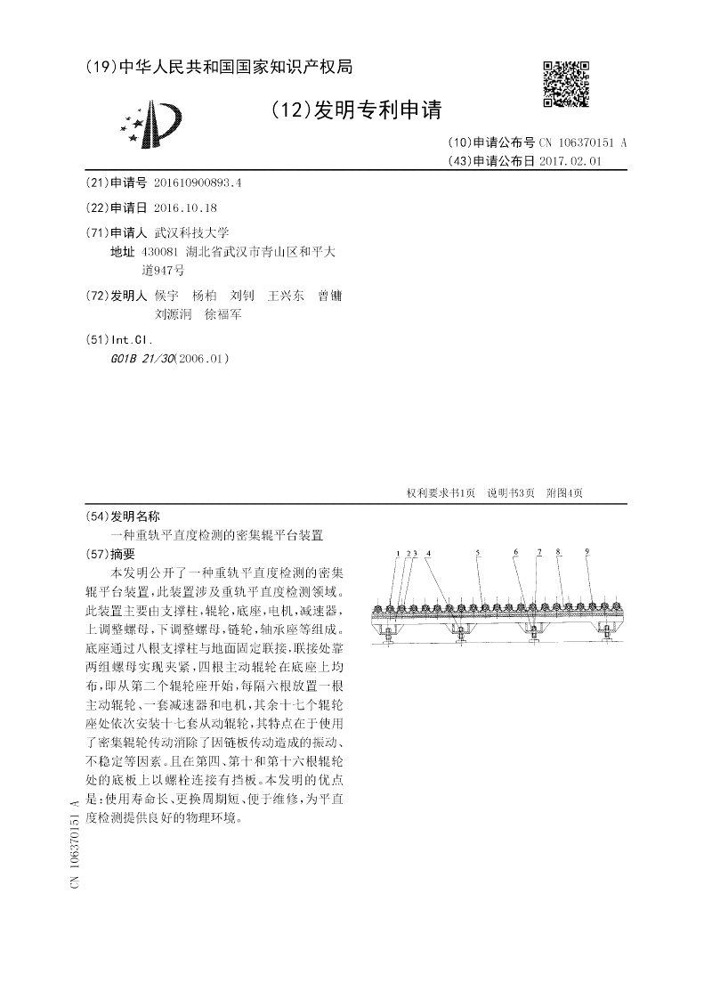本发明公开了一种重轨平直度检测的密集辊平台装置,此装置涉及重轨平直度检测领域。此装置主要由支撑柱,辊轮,底座,电机,减速器,上调整螺母,下调整螺母,链轮,轴承座等组成。底座通过八根支撑柱与地面固定联接,联接处靠两组螺母实现夹紧,四根主动辊轮在底座上均布,即从第二个辊轮座开始,每隔六根放置一根主动辊轮、一套减速器和电机,其余十七个辊轮座处依次安装十七套从动辊轮,其特点在于使用了密集辊轮传动消除了因链板传动造成的振动、不稳定等因素。且在第四、第十和第十六根辊轮处的底板上以螺栓连接有挡板。本发明的优点是:使用寿命长、更换周期短、便于维修,为平直度检测提供良好的物理环境。