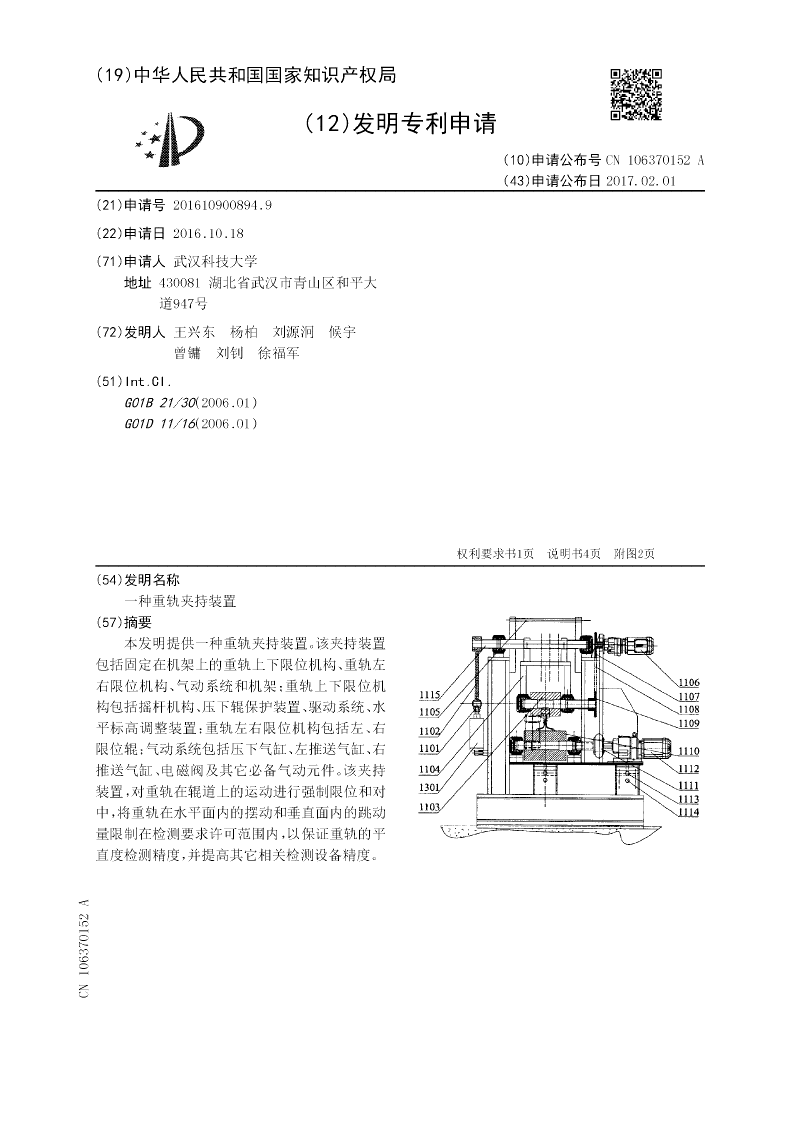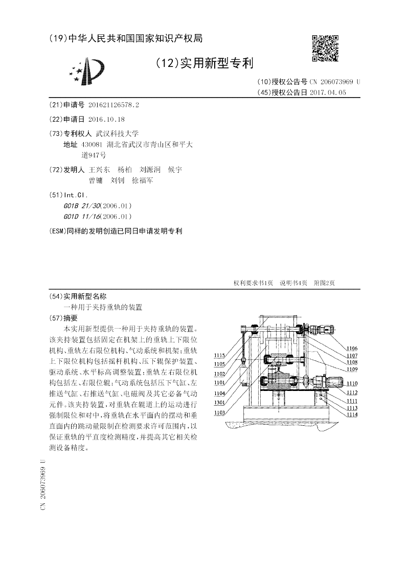 本实用新型提供一种用于夹持重轨的装置。该夹持装置包括固定在机架上的重轨上下限位机构、重轨左右限位机构、气动系统和机架;重轨上下限位机构包括摇杆机构、压下辊保护装置、驱动系统、水平标高调整装置;重轨左右限位机构包括左、右限位辊;气动系统包括压下气缸、左推送气缸、右推送气缸、电磁阀及其它必备气动元件。该夹持装置,对重轨在辊道上的运动进行强制限位和对中,将重轨在水平面内的摆动和垂直面内的跳动量限制在检测要求许可范围内,以保证重轨的平直度检测精度,并提高其它相关检测设备精度。