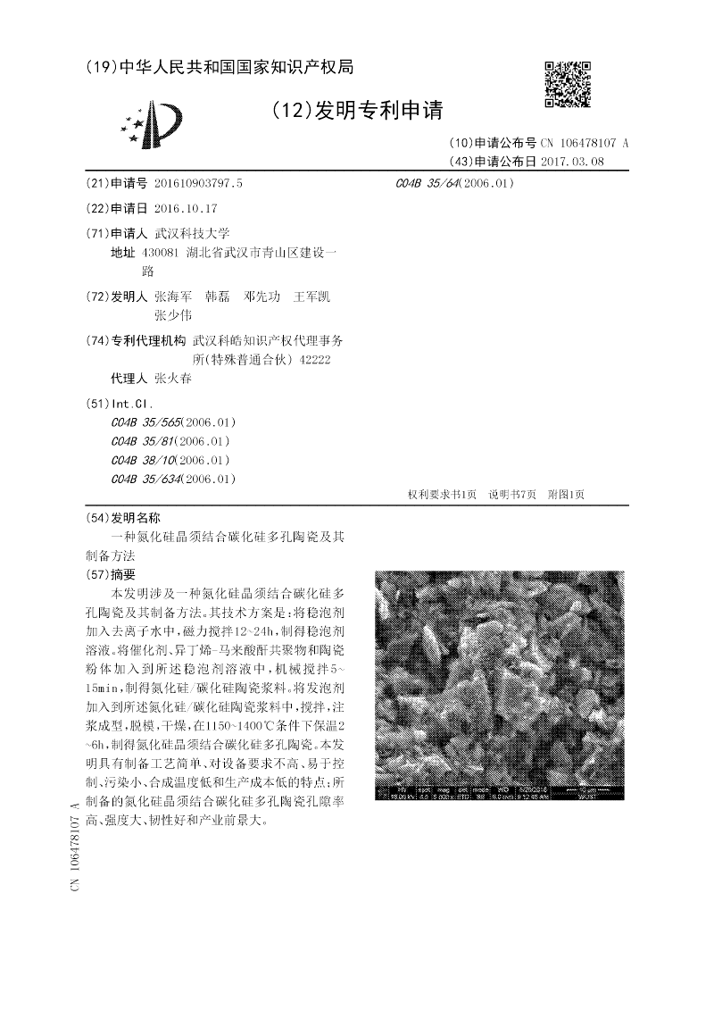 本发明涉及一种氮化硅晶须结合碳化硅多孔陶瓷及其制备方法。其技术方案是:将稳泡剂加入去离子水中,磁力搅拌12~24h,制得稳泡剂溶液。将催化剂、异丁烯‑马来酸酐共聚物和陶瓷粉体加入到所述稳泡剂溶液中,机械搅拌5~15min,制得氮化硅/碳化硅陶瓷浆料。将发泡剂加入到所述氮化硅/碳化硅陶瓷浆料中,搅拌,注浆成型,脱模,干燥,在1150~1400℃条件下保温2~6h,制得氮化硅晶须结合碳化硅多孔陶瓷。本发明具有制备工艺简单、对设备要求不高、易于控制、污染小、合成温度低和生产成本低的特点;所制备的氮化硅晶须结合碳化硅多孔陶瓷孔隙率高、强度大、韧性好和产业前景大。
