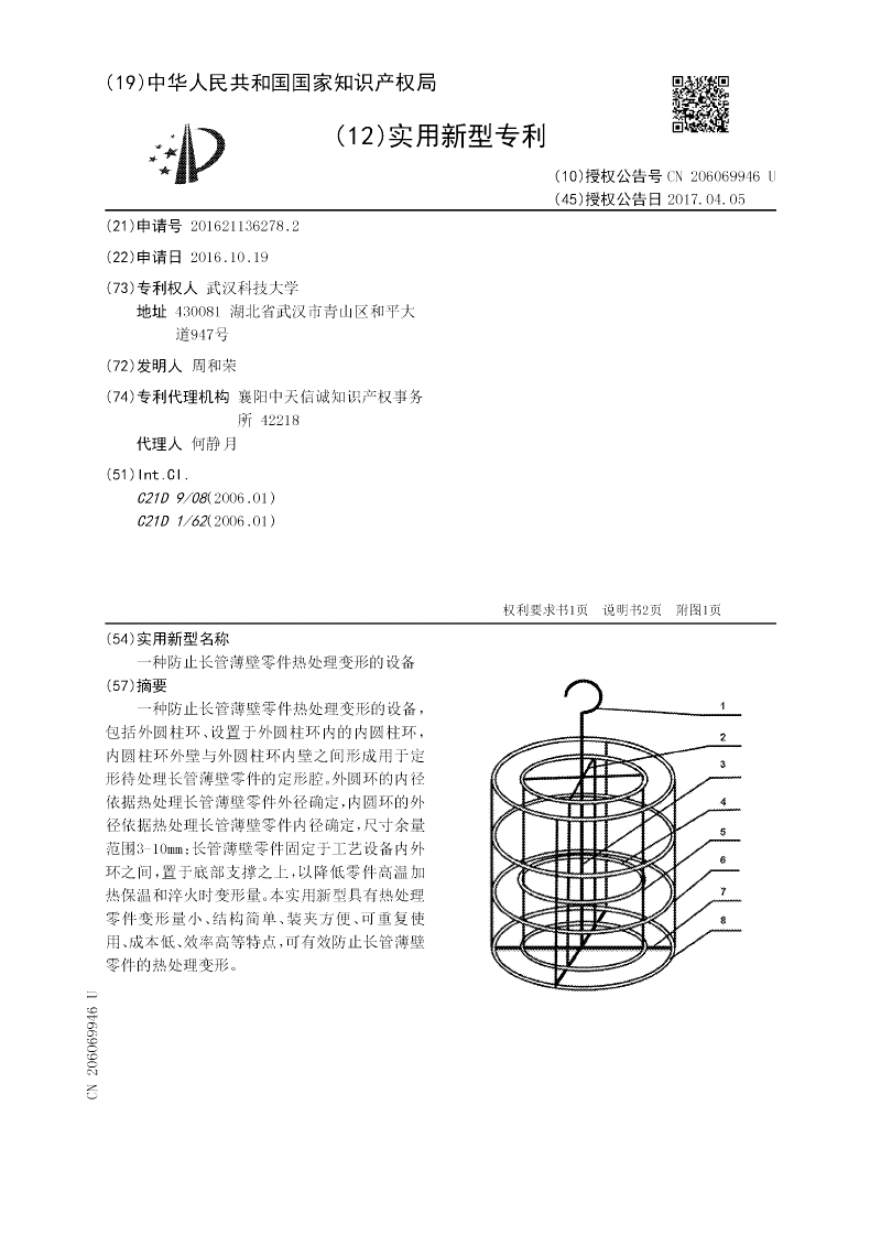 一种防止长管薄壁零件热处理变形的设备,包括外圆柱环、设置于外圆柱环内的内圆柱环,内圆柱环外壁与外圆柱环内壁之间形成用于定形待处理长管薄壁零件的定形腔。外圆环的内径依据热处理长管薄壁零件外径确定,内圆环的外径依据热处理长管薄壁零件内径确定,尺寸余量范围3‑10mm;长管薄壁零件固定于工艺设备内外环之间,置于底部支撑之上,以降低零件高温加热保温和淬火时变形量。本实用新型具有热处理零件变形量小、结构简单、装夹方便、可重复使用、成本低、效率高等特点,可有效防止长管薄壁零件的热处理变形。