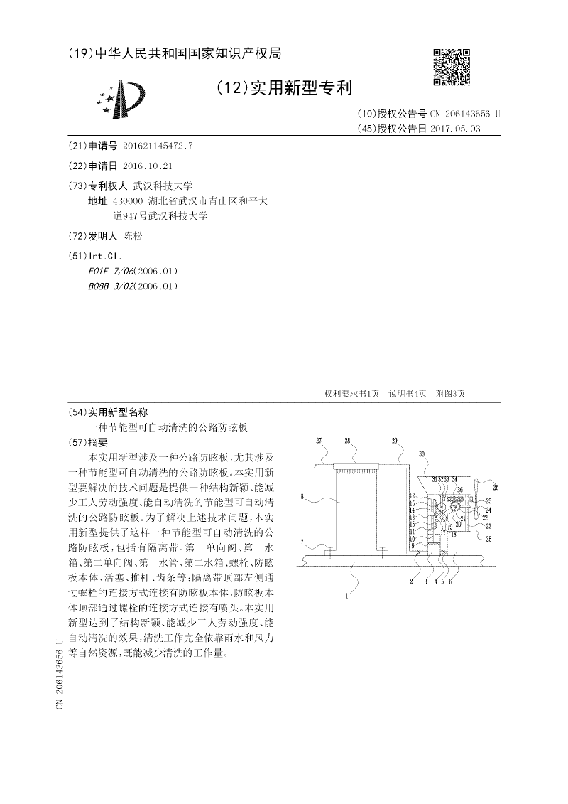 本实用新型涉及一种公路防眩板,尤其涉及一种节能型可自动清洗的公路防眩板。本实用新型要解决的技术问题是提供一种结构新颖、能减少工人劳动强度、能自动清洗的节能型可自动清洗的公路防眩板。为了解决上述技术问题,本实用新型提供了这样一种节能型可自动清洗的公路防眩板,包括有隔离带、第一单向阀、第一水箱、第二单向阀、第一水管、第二水箱、螺栓、防眩板本体、活塞、推杆、齿条等;隔离带顶部左侧通过螺栓的连接方式连接有防眩板本体,防眩板本体顶部通过螺栓的连接方式连接有喷头。本实用新型达到了结构新颖、能减少工人劳动强度、能自动清洗的效果,清洗工作完全依靠雨水和风力等自然资源,既能减少清洗的工作量。
