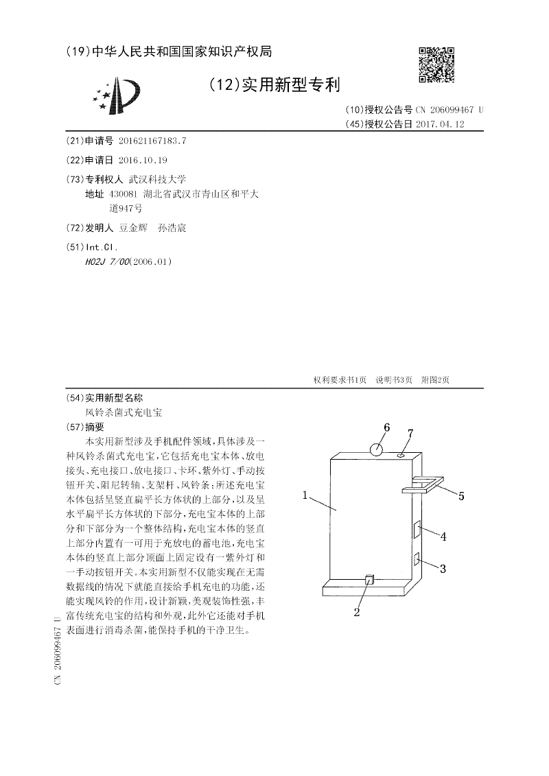本实用新型涉及手机配件领域,具体涉及一种风铃杀菌式充电宝,它包括充电宝本体、放电接头、充电接口、放电接口、卡环、紫外灯、手动按钮开关、阻尼转轴、支架杆、风铃条;所述充电宝本体包括呈竖直扁平长方体状的上部分,以及呈水平扁平长方体状的下部分,充电宝本体的上部分和下部分为一个整体结构,充电宝本体的竖直上部分内置有一可用于充放电的蓄电池,充电宝本体的竖直上部分顶面上固定设有一紫外灯和一手动按钮开关。本实用新型不仅能实现在无需数据线的情况下就能直接给手机充电的功能,还能实现风铃的作用,设计新颖,美观装饰性强,丰富传统充电宝的结构和外观,此外它还能对手机表面进行消毒杀菌,能保持手机的干净卫生。
