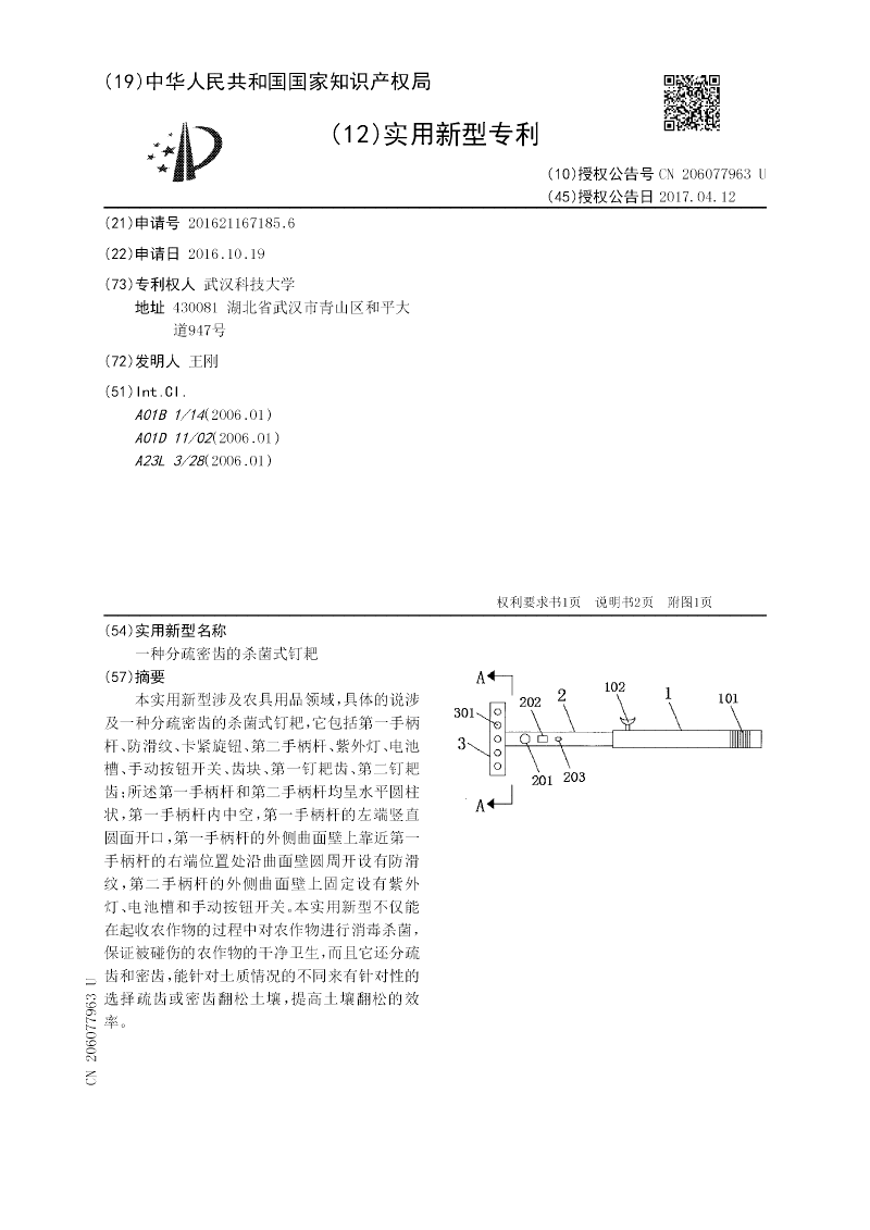 本实用新型涉及农具用品领域,具体的说涉及一种分疏密齿的杀菌式钉耙,它包括第一手柄杆、防滑纹、卡紧旋钮、第二手柄杆、紫外灯、电池槽、手动按钮开关、齿块、第一钉耙齿、第二钉耙齿;所述第一手柄杆和第二手柄杆均呈水平圆柱状,第一手柄杆内中空,第一手柄杆的左端竖直圆面开口,第一手柄杆的外侧曲面壁上靠近第一手柄杆的右端位置处沿曲面壁圆周开设有防滑纹,第二手柄杆的外侧曲面壁上固定设有紫外灯、电池槽和手动按钮开关。本实用新型不仅能在起收农作物的过程中对农作物进行消毒杀菌,保证被碰伤的农作物的干净卫生,而且它还分疏齿和密齿,能针对土质情况的不同来有针对性的选择疏齿或密齿翻松土壤,提高土壤翻松的效率。