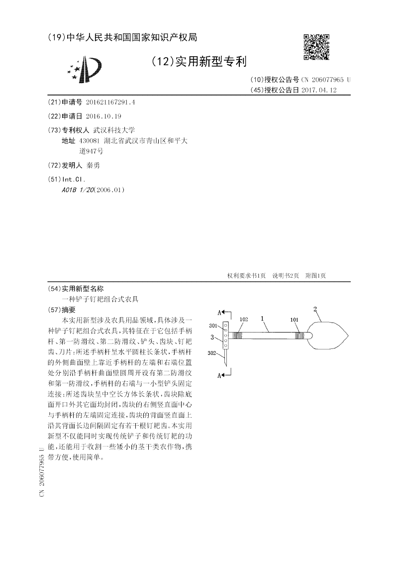 本实用新型涉及农具用品领域,具体涉及一种铲子钉耙组合式农具,其特征在于它包括手柄杆、第一防滑纹、第二防滑纹、铲头、齿块、钉耙齿、刀片;所述手柄杆呈水平圆柱长条状,手柄杆的外侧曲面壁上靠近手柄杆的左端和右端位置处分别沿手柄杆曲面壁圆周开设有第二防滑纹和第一防滑纹,手柄杆的右端与一小型铲头固定连接;所述齿块呈中空长方体长条状,齿块除底面开口外其它面均封闭,齿块的右侧竖直面中心与手柄杆的左端固定连接,齿块的背面竖直面上沿其背面长边间隔固定有若干根钉耙齿。本实用新型不仅能同时实现传统铲子和传统钉耙的功能,还能用于收割一些矮小的茎干类农作物,携带方便,使用简单。