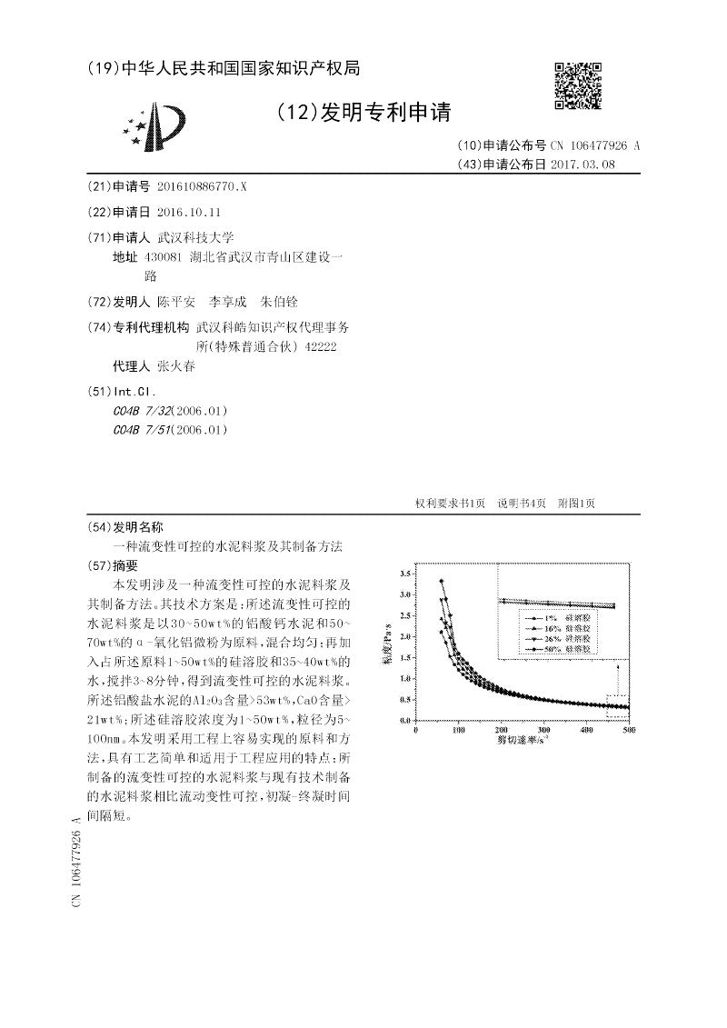本发明涉及一种流变性可控的水泥料浆及其制备方法。其技术方案是:所述流变性可控的水泥料浆是以30~50wt%的铝酸钙水泥和50~70wt%的α?氧化铝微粉为原料,混合均匀;再加入占所述原料1~50wt%的硅溶胶和35~40wt%的水,搅拌3~8分钟,得到流变性可控的水泥料浆。所述铝酸盐水泥的Al2O3含量> 53wt%,CaO含量> 21wt%;所述硅溶胶浓度为1~50wt%,粒径为5~100nm。本发明采用工程上容易实现的原料和方法,具有工艺简单和适用于工程应用的特点;所制备的流变性可控的水泥料浆与现有技术制备的水泥料浆相比流动变性可控,初凝?终凝时间间隔短。