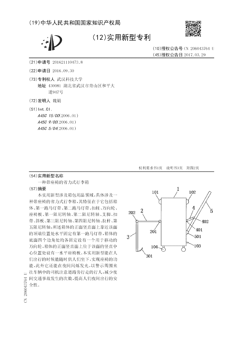本实用新型涉及箱包用品领域,具体涉及一种带座椅的省力式行李箱,其特征在于它包括箱体、第一跑马灯带、第二跑马灯带、扣柱、万向轮、座椅板、第一阻尼转轴、第二阻尼转轴、支脚、扣带、斜板、第三阻尼转轴、第四阻尼转轴、拉杆、第五阻尼转轴;所述箱体的正面竖直面上靠近该面的顶端位置处水平固定有第一跑马灯带,箱体的底面四个边角处均各固定设有一个用于移动的万向轮,箱体的正面竖直面上位于该面的竖直中心位置处设有一水平座椅板。本实用新型能在人们出行的时候能随时供人们坐下,实现座椅的功能,此外它还能在夜间闪烁发光,以警示周围来往车辆中的司机注意道路旁行走的行人,减少夜间交通事故发生的次数,提高人们夜间出行的安全性。