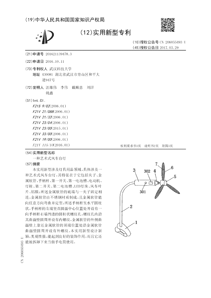 本实用新型涉及灯具用品领域,具体涉及一种艺术式风车台灯,其特征在于它包括夹子、金属软管、手柄杆、第一开关、第一电池槽、电动机、灯柱、第二开关、第二电池槽、LED灯珠、风车叶片、铝膜;所述金属软管的底端与一夹子固定相连,金属软管由不锈钢材质制成,且金属软管能向任意方向弯曲并定型;所述手柄杆呈水平圆柱状,手柄杆的左端竖直圆面中心位置处开设有一向手柄杆右端凹进的圆柱状螺纹孔,螺纹孔内沿其曲面壁圆周开设有内螺纹,金属软管的外侧曲面壁上靠近金属软管的顶端位置处沿金属软管曲面壁圆周开设有外螺纹。本实用新型设计新颖,美观性强,能起到良好的装饰作用,而且它还能被拆卸下来当做手电筒使用。