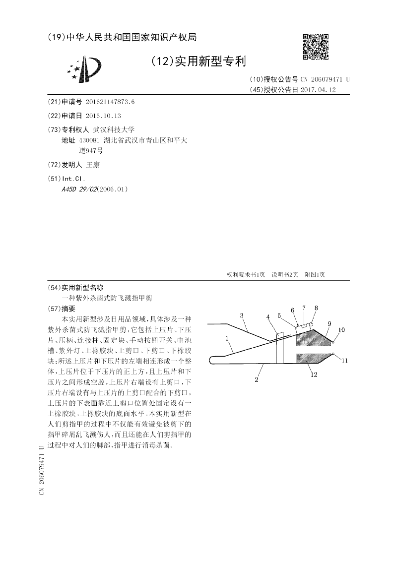 本实用新型涉及日用品领域,具体涉及一种紫外杀菌式防飞溅指甲剪,它包括上压片、下压片、压柄、连接柱、固定块、手动按钮开关、电池槽、紫外灯、上橡胶块、上剪口、下剪口、下橡胶块;所述上压片和下压片的左端相连形成一个整体,上压片位于下压片的正上方,且上压片和下压片之间形成空腔,上压片右端设有上剪口,下压片右端设有与上压片的上剪口配合的下剪口,上压片的下表面靠近上剪口位置处固定设有一上橡胶块,上橡胶块的底面水平。本实用新型在人们剪指甲的过程中不仅能有效避免被剪下的指甲碎屑乱飞溅伤人,而且还能在人们剪指甲的过程中对人们的脚部、指甲进行消毒杀菌。