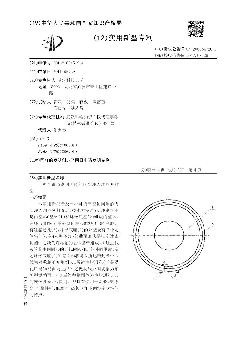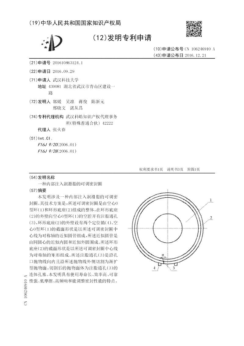 本实用新型涉及一种可调节密封间隙的内部注入油脂密封圈。其技术方案是:所述密封圈是由空心O型环(1)和环形底座(2)组成的整体,在环形底座(2)的外壁向空心O型环(1)的空腔开有注脂通孔(3),环形底座(2)的外壁设有两个定位销(4)。空心O型环(1)的截面形状是以所述密封圈中心线为对称轴的近似圆管组成,所述近似圆管是由同圆心的近似内圆和近似外圆围成。所述环形底座(2)的截面形状是以所述密封圈中心线为对称轴的矩形组成。所述注脂通孔(3)是沿孔口抛物线向内且沿所述抛物线外侧切割为渐扩型抛物面,切割后的抛物面体为注脂通孔(3)的连体孔塞。本实用新型具有使用寿命长、效率高、可靠性强、低摩擦、高频响和能调整密封性能的特点。