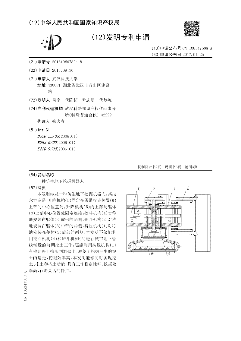 本发明涉及一种仿生地下挖掘机器人。其技术方案是:升降机构(5)固定在履带行走装置(6)上部的中心位置处,升降机构(5)的上部与躯体(3)上部中心位置处固定连接;挖斗机构(4)对称地安装在躯体(3)前部的两侧,铲斗机构(2)对称地安装在躯体(3)中部的两侧,挤压机构(1)对称地安装在躯体(3)后部的两侧。本发明不仅能利用挖斗机构(4)和铲斗机构(2)进行城市地下管线铺设的前期挖土工作,还能利用挤压机构(1)有效地将土挤压到洞壁上,避免了挖掘产生的泥土的运走,挖掘效率高。本发明能够同时实现挖土、排土和挤土功能,具有工作稳定性好、挖掘效率高、行走灵活的特点。