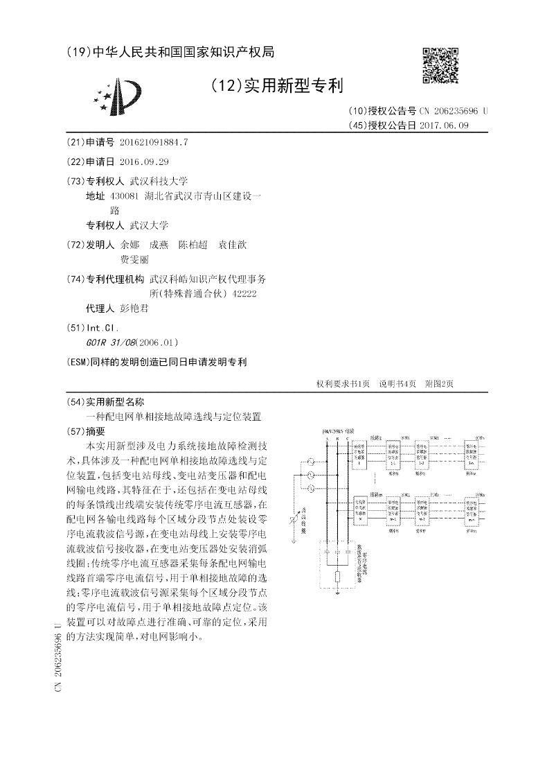 本实用新型涉及电力系统接地故障检测技术,具体涉及一种配电网单相接地故障选线与定位装置,包括变电站母线、变电站变压器和配电网输电线路,其特征在于,还包括在变电站母线的每条馈线出线端安装传统零序电流互感器,在配电网各输电线路每个区域分段节点处装设零序电流载波信号源,在变电站母线上安装零序电流载波信号接收器,在变电站变压器处安装消弧线圈;传统零序电流互感器采集每条配电网输电线路首端零序电流信号,用于单相接地故障的选线;零序电流载波信号源采集每个区域分段节点的零序电流信号,用于单相接地故障点定位。该装置可以对故障点进行准确、可靠的定位,采用的方法实现简单,对电网影响小。