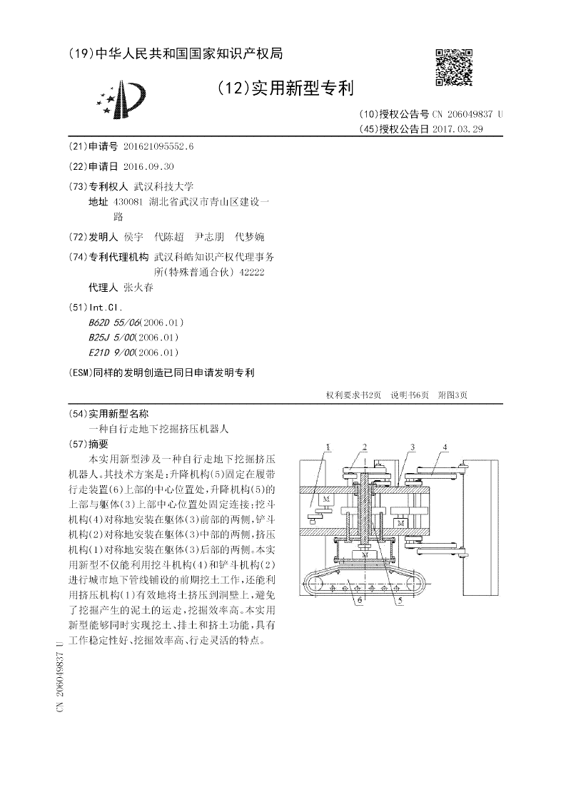 本实用新型涉及一种自行走地下挖掘挤压机器人。其技术方案是:升降机构(5)固定在履带行走装置(6)上部的中心位置处,升降机构(5)的上部与躯体(3)上部中心位置处固定连接;挖斗机构(4)对称地安装在躯体(3)前部的两侧,铲斗机构(2)对称地安装在躯体(3)中部的两侧,挤压机构(1)对称地安装在躯体(3)后部的两侧。本实用新型不仅能利用挖斗机构(4)和铲斗机构(2)进行城市地下管线铺设的前期挖土工作,还能利用挤压机构(1)有效地将土挤压到洞壁上,避免了挖掘产生的泥土的运走,挖掘效率高。本实用新型能够同时实现挖土、排土和挤土功能,具有工作稳定性好、挖掘效率高、行走灵活的特点。