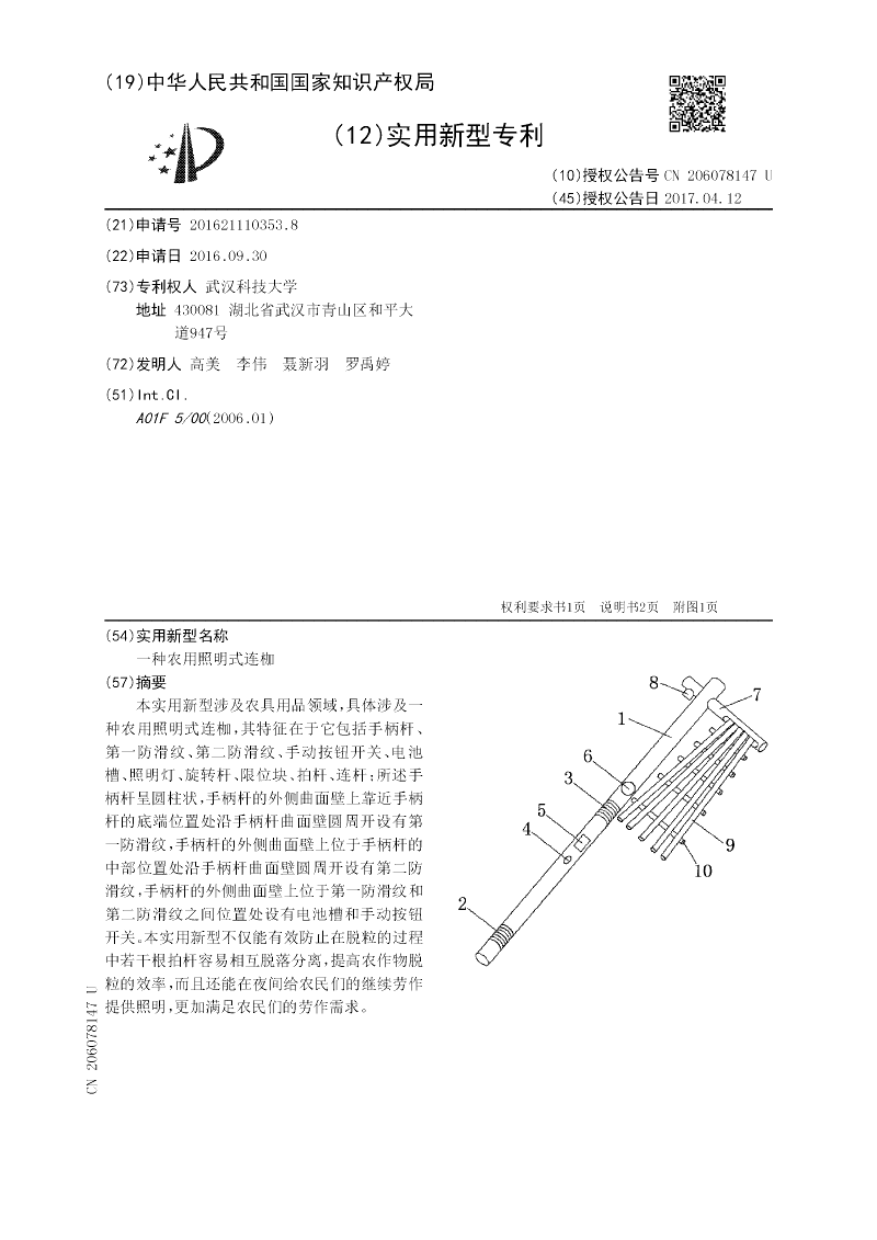 本实用新型涉及农具用品领域,具体涉及一种农用照明式连枷,其特征在于它包括手柄杆、第一防滑纹、第二防滑纹、手动按钮开关、电池槽、照明灯、旋转杆、限位块、拍杆、连杆;所述手柄杆呈圆柱状,手柄杆的外侧曲面壁上靠近手柄杆的底端位置处沿手柄杆曲面壁圆周开设有第一防滑纹,手柄杆的外侧曲面壁上位于手柄杆的中部位置处沿手柄杆曲面壁圆周开设有第二防滑纹,手柄杆的外侧曲面壁上位于第一防滑纹和第二防滑纹之间位置处设有电池槽和手动按钮开关。本实用新型不仅能有效防止在脱粒的过程中若干根拍杆容易相互脱落分离,提高农作物脱粒的效率,而且还能在夜间给农民们的继续劳作提供照明,更加满足农民们的劳作需求。