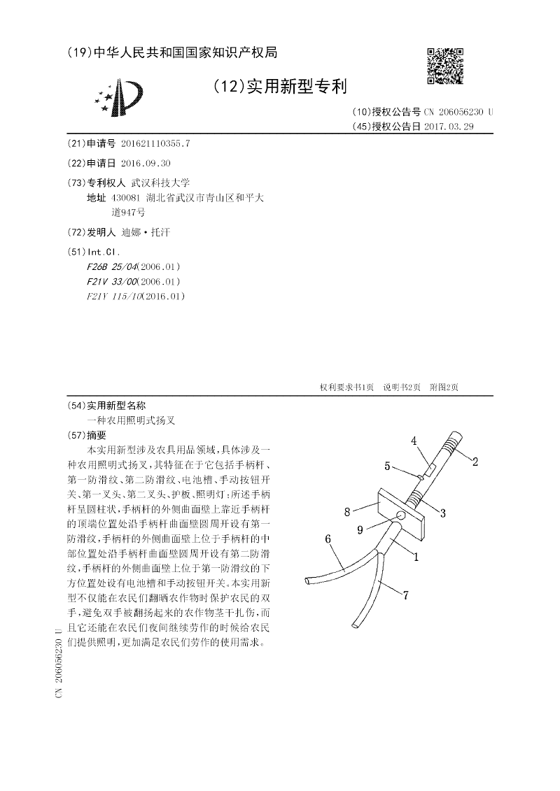 本实用新型涉及农具用品领域,具体涉及一种农用照明式扬叉,其特征在于它包括手柄杆、第一防滑纹、第二防滑纹、电池槽、手动按钮开关、第一叉头、第二叉头、护板、照明灯;所述手柄杆呈圆柱状,手柄杆的外侧曲面壁上靠近手柄杆的顶端位置处沿手柄杆曲面壁圆周开设有第一防滑纹,手柄杆的外侧曲面壁上位于手柄杆的中部位置处沿手柄杆曲面壁圆周开设有第二防滑纹,手柄杆的外侧曲面壁上位于第一防滑纹的下方位置处设有电池槽和手动按钮开关。本实用新型不仅能在农民们翻晒农作物时保护农民的双手,避免双手被翻扬起来的农作物茎干扎伤,而且它还能在农民们夜间继续劳作的时候给农民们提供照明,更加满足农民们劳作的使用需求。