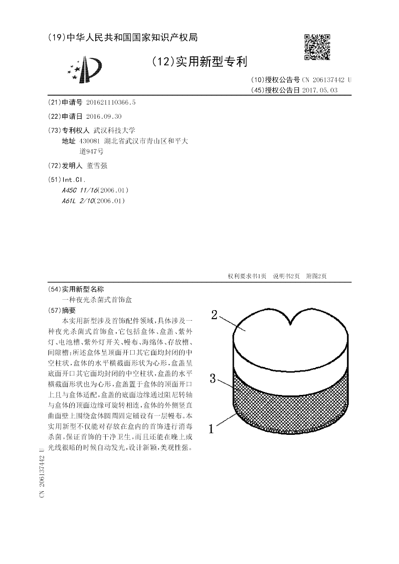 本实用新型涉及首饰配件领域,具体涉及一种夜光杀菌式首饰盒,它包括盒体、盒盖、紫外灯、电池槽、紫外灯开关、幔布、海绵体、存放槽、间隙槽;所述盒体呈顶面开口其它面均封闭的中空柱状,盒体的水平横截面形状为心形,盒盖呈底面开口其它面均封闭的中空柱状,盒盖的水平横截面形状也为心形,盒盖置于盒体的顶面开口上且与盒体适配,盒盖的底面边缘通过阻尼转轴与盒体的顶面边缘可旋转相连,盒体的外侧竖直曲面壁上围绕盒体圆周固定铺设有一层幔布。本实用新型不仅能对存放在盒内的首饰进行消毒杀菌,保证首饰的干净卫生,而且还能在晚上或光线很暗的时候自动发光,设计新颖,美观性强。