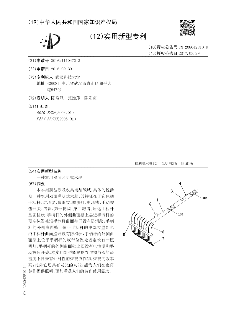 本实用新型涉及农具用品领域,具体的说涉及一种农用双面照明式木耙,其特征在于它包括手柄杆、防滑纹、防滑纹、照明灯、电池槽、手动按钮开关、齿块、第一耙齿、第二耙齿;所述手柄杆呈圆柱状,手柄杆的外侧曲面壁上靠近手柄杆的顶端位置处沿手柄杆曲面壁开设有防滑纹,手柄杆的外侧曲面壁上位于手柄杆的中部位置处也沿手柄杆曲面壁开设有防滑纹,手柄杆的外侧曲面壁上位于手柄杆的底部位置处固定设有一照明灯,手柄杆的外侧曲面壁上还设有电池槽和手动按钮开关。本实用新型能根据农作物散落的疏密度不同来有针对性的聚拢农作物,聚拢的效率高,此外它还具有发光的功能,能为人们在夜间劳作提供照明,更加满足人们的劳作使用需求。