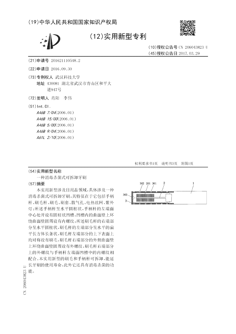 本实用新型涉及日用品领域,具体涉及一种消毒杀菌式可拆卸牙刷,其特征在于它包括手柄杆、刷毛杆、刷毛、刷套、散气孔、电热丝网、紫外灯;所述手柄杆呈水平圆柱状,手柄杆的左端面中心处开设有圆柱状凹槽,凹槽内的曲面壁上环绕曲面壁圆周设有内螺纹;所述刷毛杆的右端部分呈水平圆柱状,刷毛杆的左端部分呈水平的扁平长方体长条状,刷毛杆左端部分的上下表面上均对称设有刷毛,刷毛杆右端部分的外侧曲面壁上环绕曲面壁圆周设有外螺纹,刷毛杆右端部分上的外螺纹与手柄杆左端面凹槽中的内螺纹相配合。本实用新型的刷毛和手柄杆可拆卸,能延长牙刷的使用寿命,此外它还具有消毒杀菌的功能。
