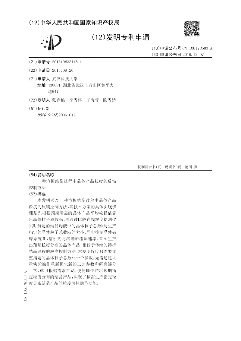 本发明涉及一种溶析结晶过程中晶体产品粒度的反馈控制方法,其技术方案的具体实现步骤是先根据预期所需的晶体产品平均粒径估算出晶体粒子总数Ns,再通过比较在线粒度检测仪实时测定的结晶母液中的晶体粒子总数N与生产指定的晶体粒子总数Ns的大小,同步控制晶体破碎系统Ⅱ、溶析剂与溶剂的流加速率,直至生产出预期粒度分布的晶体产品。相较于传统的溶析结晶过程的粒度控制方法,本发明仅仅只需要调整指定的晶体粒子总数Ns一个参数,无需通过大量实验操作重新优化新的工艺参数和研磨筛分工艺,就可根据需求自动、便捷地生产出预期指定粒度分布的结晶产品,实现了按需生产指定粒度分布结晶产品的粒度可控调节功能。