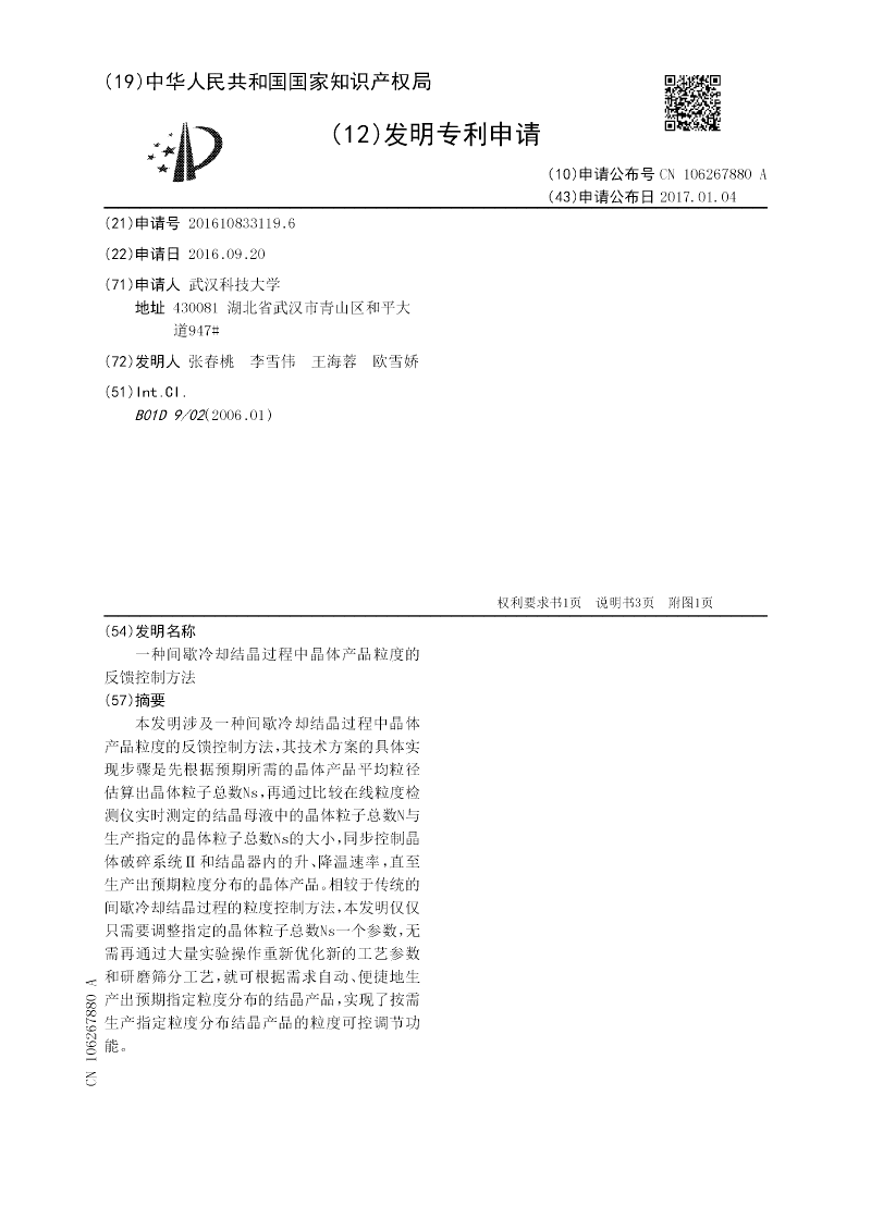 本发明涉及一种间歇冷却结晶过程中晶体产品粒度的反馈控制方法,其技术方案的具体实现步骤是先根据预期所需的晶体产品平均粒径估算出晶体粒子总数Ns,再通过比较在线粒度检测仪实时测定的结晶母液中的晶体粒子总数N与生产指定的晶体粒子总数Ns的大小,同步控制晶体破碎系统Ⅱ和结晶器内的升、降温速率,直至生产出预期粒度分布的晶体产品。相较于传统的间歇冷却结晶过程的粒度控制方法,本发明仅仅只需要调整指定的晶体粒子总数Ns一个参数,无需再通过大量实验操作重新优化新的工艺参数和研磨筛分工艺,就可根据需求自动、便捷地生产出预期指定粒度分布的结晶产品,实现了按需生产指定粒度分布结晶产品的粒度可控调节功能。