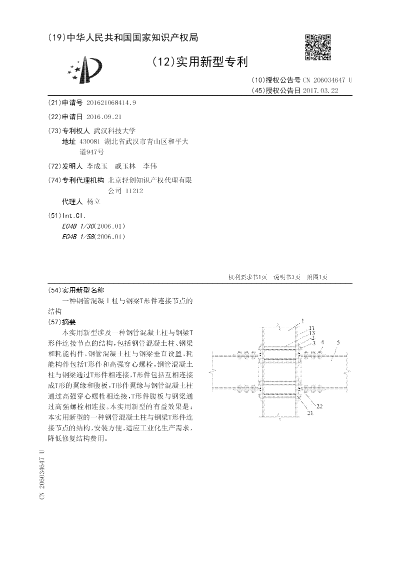 本实用新型涉及一种钢管混凝土柱与钢梁T形件连接节点的结构,包括钢管混凝土柱、钢梁和耗能构件,钢管混凝土柱与钢梁垂直设置,耗能构件包括T形件和高强穿心螺栓,钢管混凝土柱与钢梁通过T形件相连接,T形件包括互相连接成T形的翼缘和腹板,T形件翼缘与钢管混凝土柱通过高强穿心螺栓相连接,T形件腹板与钢梁通过高强螺栓相连接。本实用新型的有益效果是:本实用新型的一种钢管混凝土柱与钢梁T形件连接节点的结构,安装方便,适应工业化生产需求,降低修复结构费用。