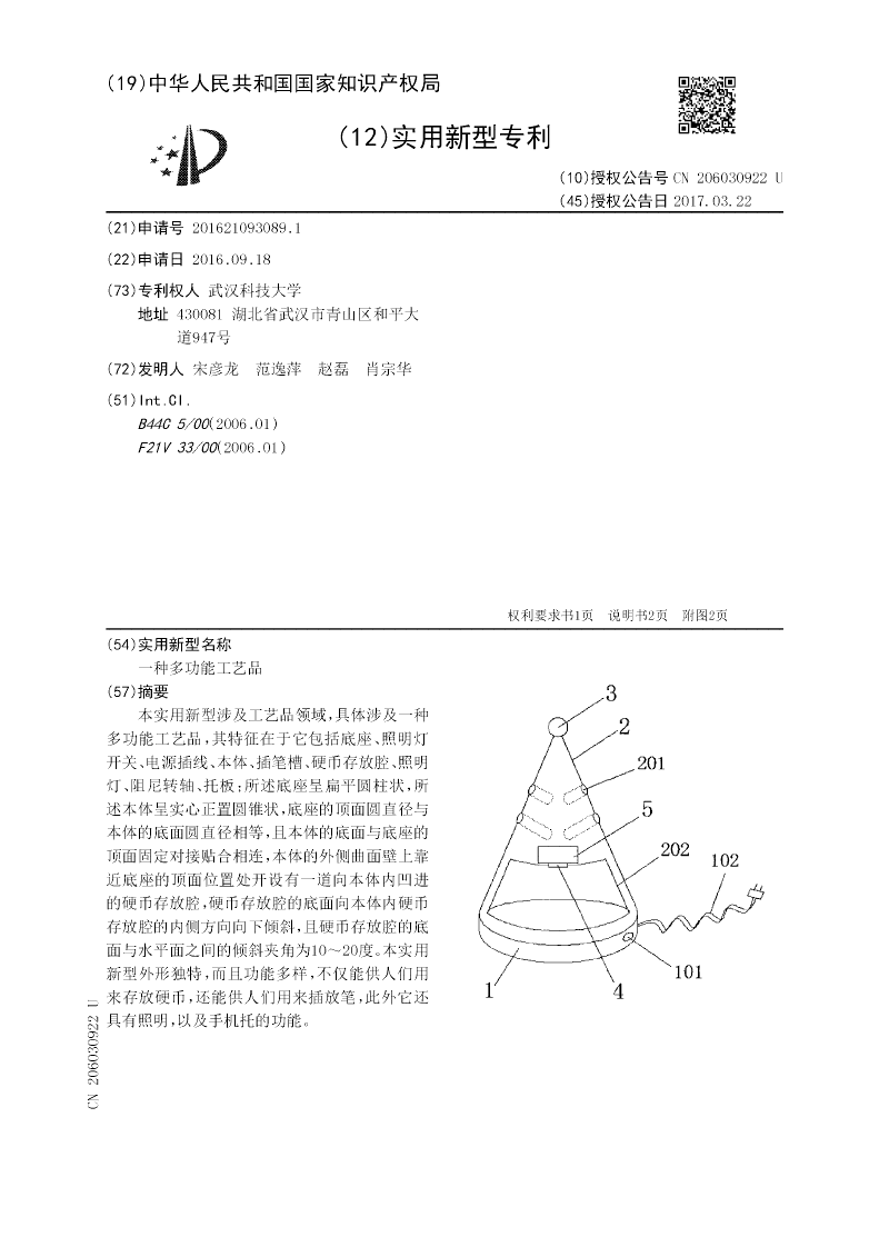 本实用新型涉及工艺品领域,具体涉及一种多功能工艺品,其特征在于它包括底座、照明灯开关、电源插线、本体、插笔槽、硬币存放腔、照明灯、阻尼转轴、托板;所述底座呈扁平圆柱状,所述本体呈实心正置圆锥状,底座的顶面圆直径与本体的底面圆直径相等,且本体的底面与底座的顶面固定对接贴合相连,本体的外侧曲面壁上靠近底座的顶面位置处开设有一道向本体内凹进的硬币存放腔,硬币存放腔的底面向本体内硬币存放腔的内侧方向向下倾斜,且硬币存放腔的底面与水平面之间的倾斜夹角为10~20度。本实用新型外形独特,而且功能多样,不仅能供人们用来存放硬币,还能供人们用来插放笔,此外它还具有照明,以及手机托的功能。