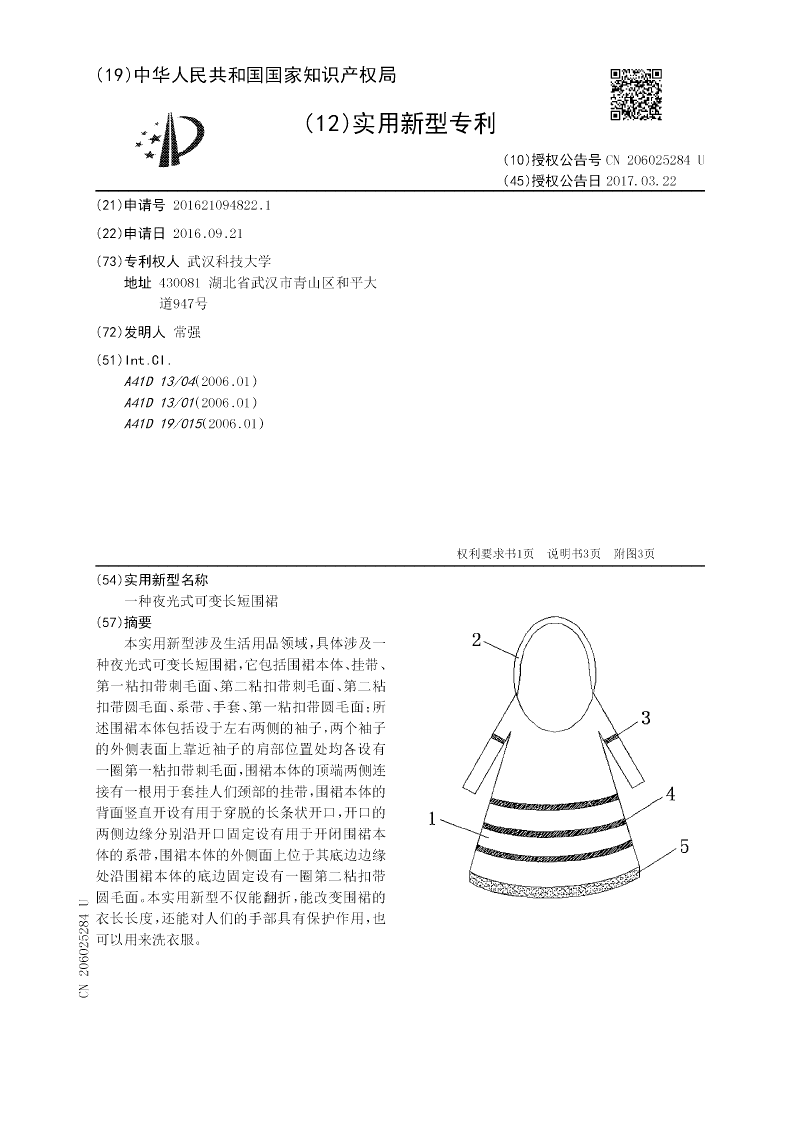 本实用新型涉及生活用品领域,具体涉及一种夜光式可变长短围裙,它包括围裙本体、挂带、第一粘扣带刺毛面、第二粘扣带刺毛面、第二粘扣带圆毛面、系带、手套、第一粘扣带圆毛面;所述围裙本体包括设于左右两侧的袖子,两个袖子的外侧表面上靠近袖子的肩部位置处均各设有一圈第一粘扣带刺毛面,围裙本体的顶端两侧连接有一根用于套挂人们颈部的挂带,围裙本体的背面竖直开设有用于穿脱的长条状开口,开口的两侧边缘分别沿开口固定设有用于开闭围裙本体的系带,围裙本体的外侧面上位于其底边边缘处沿围裙本体的底边固定设有一圈第二粘扣带圆毛面。本实用新型不仅能翻折,能改变围裙的衣长长度,还能对人们的手部具有保护作用,也可以用来洗衣服。
