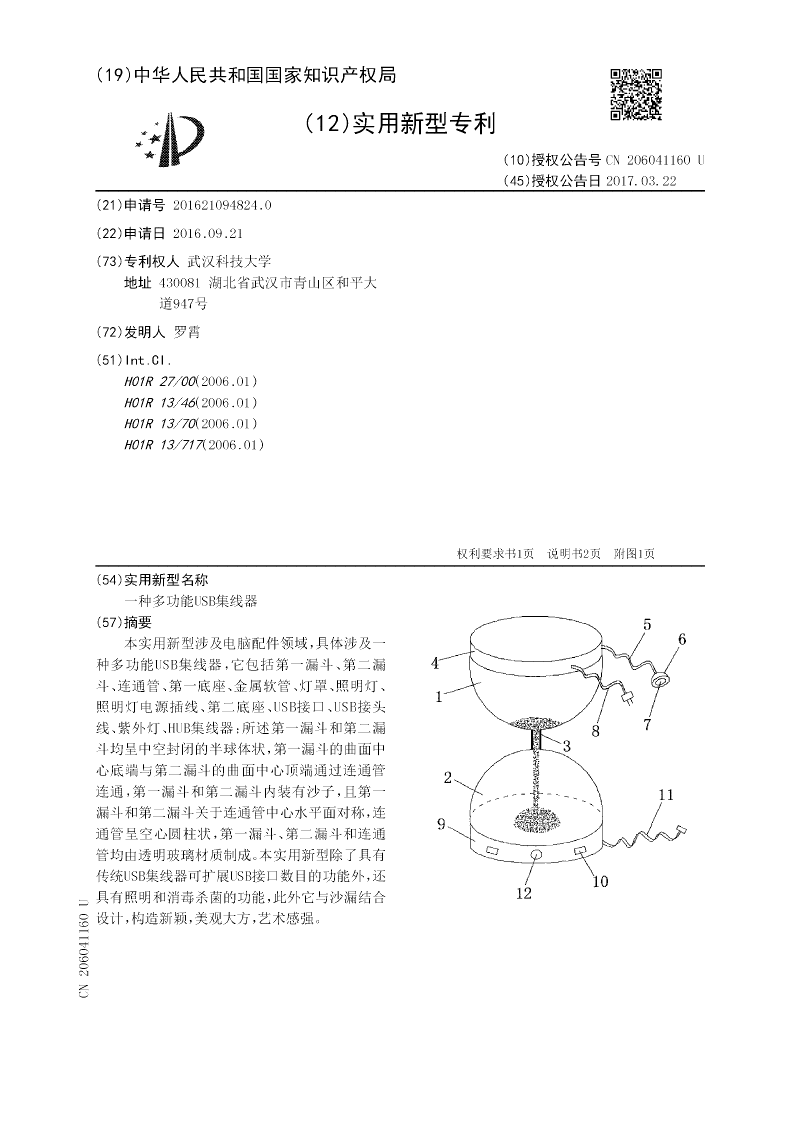 本实用新型涉及电脑配件领域,具体涉及一种多功能USB集线器,它包括第一漏斗、第二漏斗、连通管、第一底座、金属软管、灯罩、照明灯、照明灯电源插线、第二底座、USB接口、USB接头线、紫外灯、HUB集线器;所述第一漏斗和第二漏斗均呈中空封闭的半球体状,第一漏斗的曲面中心底端与第二漏斗的曲面中心顶端通过连通管连通,第一漏斗和第二漏斗内装有沙子,且第一漏斗和第二漏斗关于连通管中心水平面对称,连通管呈空心圆柱状,第一漏斗、第二漏斗和连通管均由透明玻璃材质制成。本实用新型除了具有传统USB集线器可扩展USB接口数目的功能外,还具有照明和消毒杀菌的功能,此外它与沙漏结合设计,构造新颖,美观大方,艺术感强。