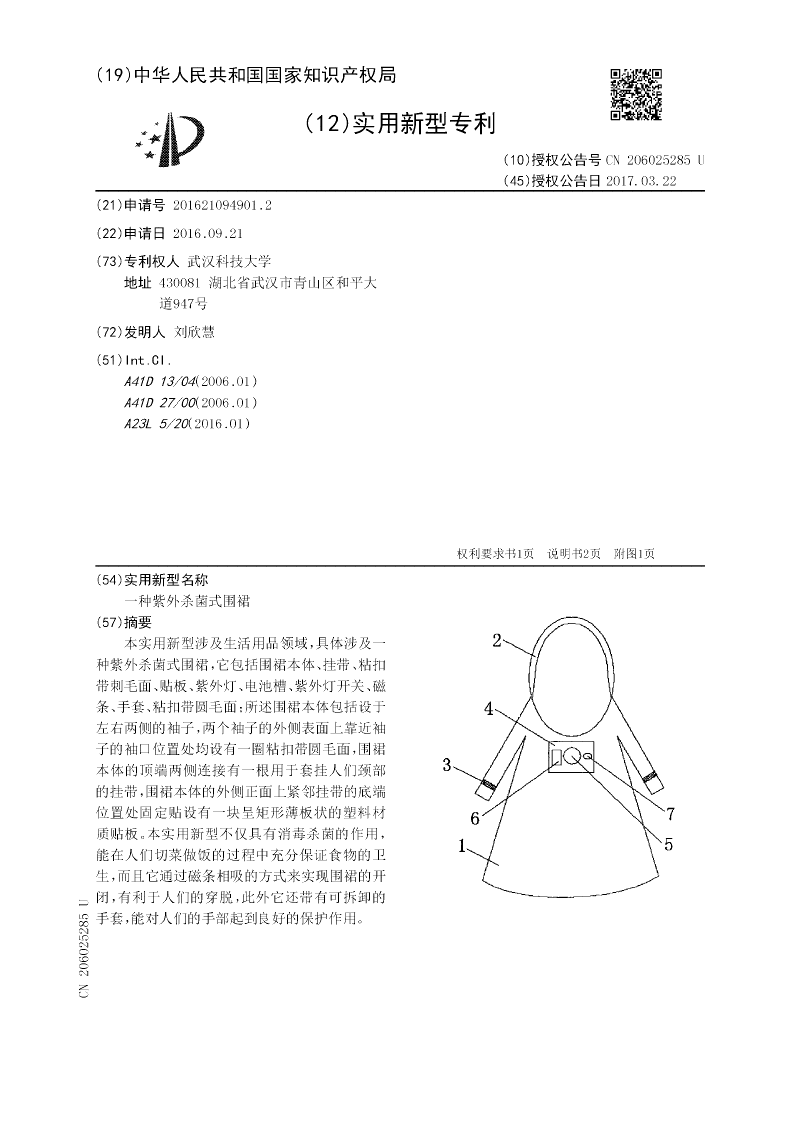 一种紫外杀菌式围裙