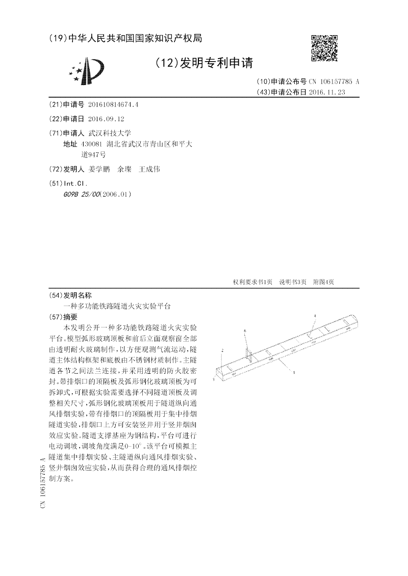 本发明公开一种多功能铁路隧道火灾实验平台。模型弧形玻璃顶板和前后立面观察窗全部由透明耐火玻璃制作,以方便观测气流运动,隧道主体结构框架和底板由不锈钢材质制作。主隧道各节之间法兰连接,并采用透明的防火胶密封。带排烟口的顶隔板及弧形钢化玻璃顶板为可拆卸式,可根据实验需要选择不同隧道顶板及调整相关尺寸,弧形钢化玻璃顶板用于隧道纵向通风排烟实验,带有排烟口的顶隔板用于集中排烟隧道实验,排烟口上方可安装竖井用于竖井烟囱效应实验。隧道支撑基座为钢结构,平台可进行电动调坡,调坡角度满足0‑10°。该平台可模拟主隧道集中排烟实验、主隧道纵向通风排烟实验、竖井烟囱效应实验,从而获得合理的通风排烟控制方案。