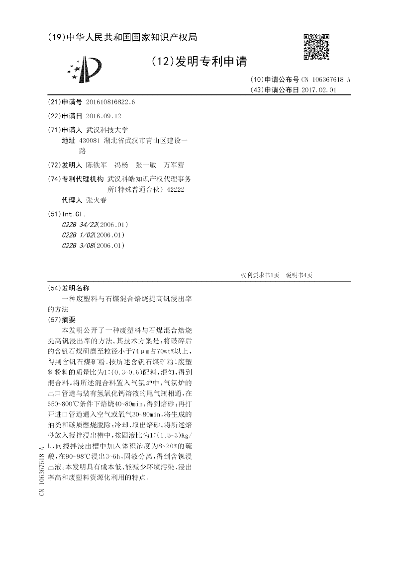 本发明公开了一种废塑料与石煤混合焙烧提高钒浸出率的方法。其技术方案是:将破碎后的含钒石煤研磨至粒径小于74μm占70wt%以上,得到含钒石煤矿粉。按所述含钒石煤矿粉∶废塑料粉料的质量比为1∶(0.3~0.6)配料,混匀,得到混合料。将所述混合料置入气氛炉中,气氛炉的出口管道与装有氢氧化钙溶液的尾气瓶相通,在650~800℃条件下焙烧40~80min,得到焙砂;再打开进口管道通入空气或氧气30~80min,将生成的油类和碳质燃烧脱除;冷却,取出焙砂。将所述焙砂放入搅拌浸出槽中,按固液比为1∶(1.5~3)Kg/L,向搅拌浸出槽中加入体积浓度为8~20%的硫酸,在90~98℃浸出3~6h,固液分离,得到含钒浸出液。本发明具有成本低、能减少环境污染、浸出率高和废塑料资源化利用的特点。