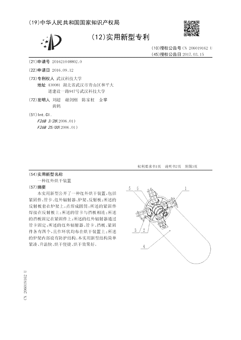 本实用新型公开了一种红外烘干装置,包括紧固件、管卡、红外辐射器、炉架、反射板;所述的反射板套在炉架上,点焊成圆筒;所述的紧固件焊接在反射板上;所述的管卡与挡板相连;所述的挡板固定在紧固件上;所述的红外辐射器通过管卡固定;所述的红外辐射器、管卡、挡板、紧固件各有四个,且作环状均布在烘干装置上;所述的炉架内部设有防护结构。本实用新型结构简单紧凑、升温快、烘干便捷、烘干效果好。