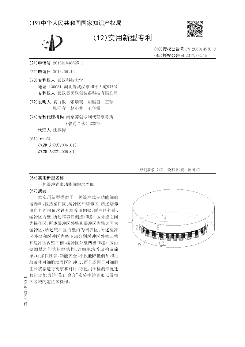 本实用新型提供了一种缓冲式多功能细胞培养皿,包括操作区、缓冲区和培养区;所述培养皿自外而内依次设有培养皿侧壁、缓冲区外壁、缓冲区内壁;所述培养皿侧壁和缓冲区外壁之间为操作区,所述缓冲区外壁和缓冲区内壁之间为缓冲区,所述缓冲区内壁内为培养区;所述缓冲区外壁和缓冲区内壁下部分别缓冲区外壁凹槽和缓冲区内壁凹槽,缓冲区外壁凹槽和缓冲区内壁凹槽之间为错缝结构。该细胞培养皿构造简单、可操作性强、功能齐全,不仅能降低滴加和抽取液体对细胞培养区的冲击,而且还便于对细胞生长状态进行观察和对比,方便用于检测细胞迁移运动能力的“伤口愈合”实验中的划痕以及拍照区域的定位等操作。