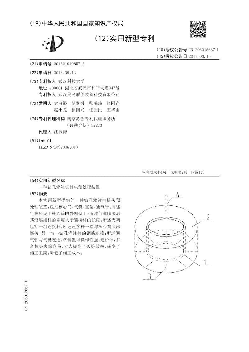本实用新型提供的一种钻孔灌注桩桩头预处理装置,包括核心筒、气囊、支架、通气管;所述气囊环设于核心筒的外侧壁上;所述气囊膨胀后其沿连接杆的宽度大于连接杆的长度;所述支架包括一组连接杆,所述连接杆一端与核心筒底部连接,另一端与钻孔灌注桩的钢筋连接;所述通气管与气囊连通。该装置可操作性强、造价低,多余桩头去除容易,大大提高了破桩效率,减少了施工工期,降低了施工成本。