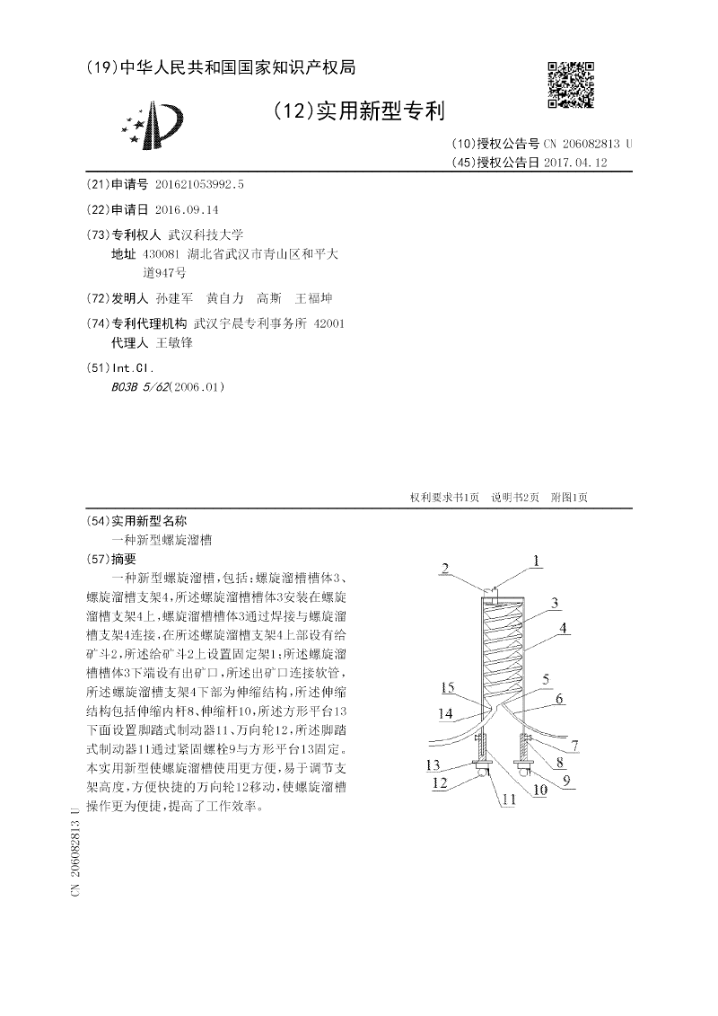 一种新型螺旋溜槽,包括:螺旋溜槽槽体3、螺旋溜槽支架4,所述螺旋溜槽槽体3安装在螺旋溜槽支架4上,螺旋溜槽槽体3通过焊接与螺旋溜槽支架4连接,在所述螺旋溜槽支架4上部设有给矿斗2,所述给矿斗2上设置固定架1;所述螺旋溜槽槽体3下端设有出矿口,所述出矿口连接软管,所述螺旋溜槽支架4下部为伸缩结构,所述伸缩结构包括伸缩内杆8、伸缩杆10,所述方形平台13下面设置脚踏式制动器11、万向轮12,所述脚踏式制动器11通过紧固螺栓9与方形平台13固定。本实用新型使螺旋溜槽使用更方便,易于调节支架高度,方便快捷的万向轮12移动,使螺旋溜槽操作更为便捷,提高了工作效率。