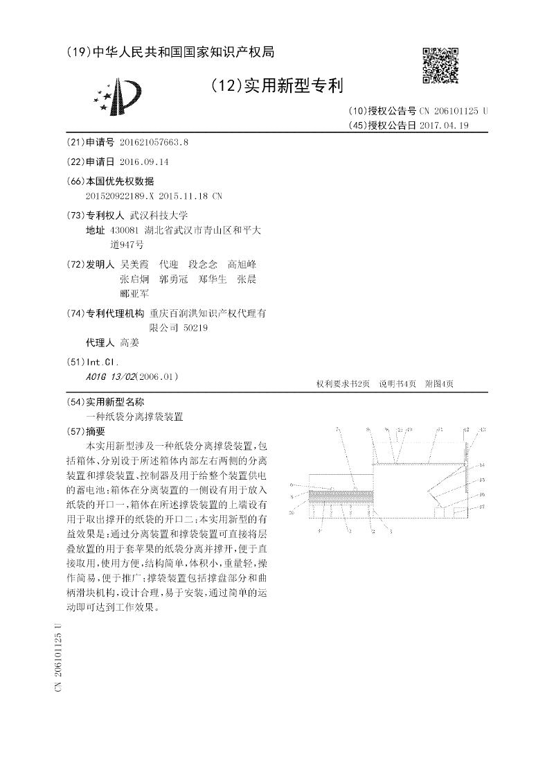 本实用新型涉及一种纸袋分离撑袋装置,包括箱体、分别设于所述箱体内部左右两侧的分离装置和撑袋装置、控制器及用于给整个装置供电的蓄电池;箱体在分离装置的一侧设有用于放入纸袋的开口一,箱体在所述撑袋装置的上端设有用于取出撑开的纸袋的开口二;本实用新型的有益效果是:通过分离装置和撑袋装置可直接将层叠放置的用于套苹果的纸袋分离并撑开,便于直接取用,使用方便,结构简单,体积小,重量轻,操作简易,便于推广;撑袋装置包括撑盘部分和曲柄滑块机构,设计合理,易于安装,通过简单的运动即可达到工作效果。