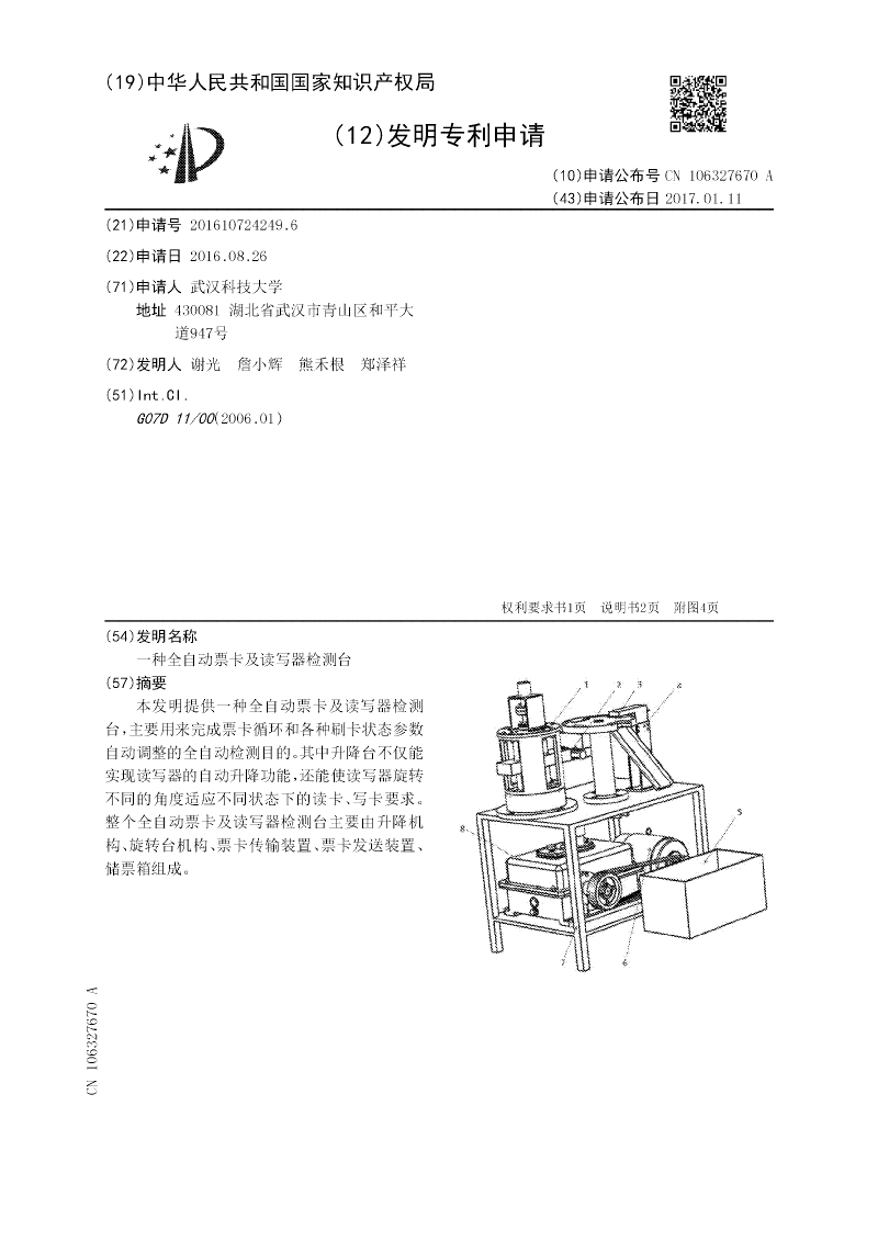 本发明提供一种全自动票卡及读写器检测台,主要用来完成票卡循环和各种刷卡状态参数自动调整的全自动检测目的。其中升降台不仅能实现读写器的自动升降功能,还能使读写器旋转不同的角度适应不同状态下的读卡、写卡要求。整个全自动票卡及读写器检测台主要由升降机构、旋转台机构、票卡传输装置、票卡发送装置、储票箱组成。