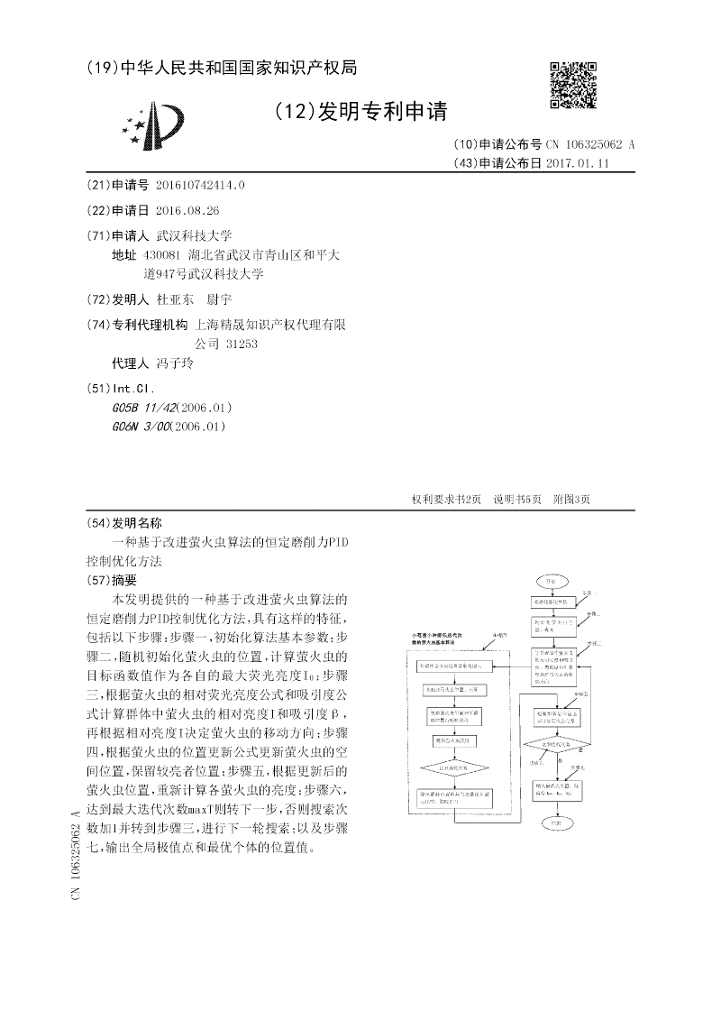 本发明提供的一种基于改进萤火虫算法的恒定磨削力PID控制优化方法,具有这样的特征,包括以下步骤:步骤一,初始化算法基本参数;步骤二,随机初始化萤火虫的位置,计算萤火虫的目标函数值作为各自的最大荧光亮度I0;步骤三,根据萤火虫的相对荧光亮度公式和吸引度公式计算群体中萤火虫的相对亮度I和吸引度β,再根据相对亮度I决定萤火虫的移动方向;步骤四,根据萤火虫的位置更新公式更新萤火虫的空间位置,保留较亮者位置;步骤五,根据更新后的萤火虫位置,重新计算各萤火虫的亮度;步骤六,达到最大迭代次数maxT则转下一步,否则搜索次数加1并转到步骤三,进行下一轮搜索;以及步骤七,输出全局极值点和最优个体的位置值。