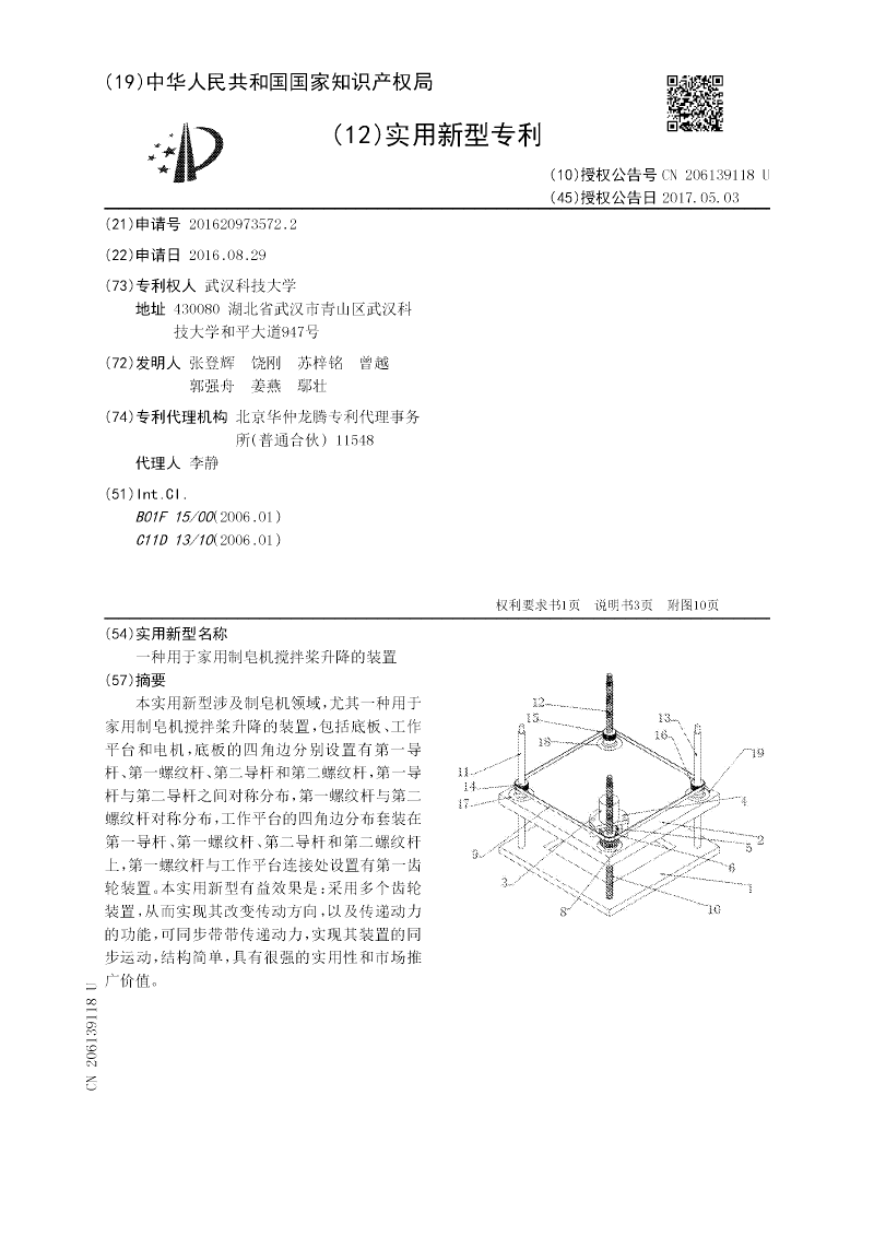 本实用新型涉及制皂机领域,尤其一种用于家用制皂机搅拌桨升降的装置,包括底板、工作平台和电机,底板的四角边分别设置有第一导杆、第一螺纹杆、第二导杆和第二螺纹杆,第一导杆与第二导杆之间对称分布,第一螺纹杆与第二螺纹杆对称分布,工作平台的四角边分布套装在第一导杆、第一螺纹杆、第二导杆和第二螺纹杆上,第一螺纹杆与工作平台连接处设置有第一齿轮装置。本实用新型有益效果是:采用多个齿轮装置,从而实现其改变传动方向,以及传递动力的功能,可同步带带传递动力,实现其装置的同步运动,结构简单,具有很强的实用性和市场推广价值。