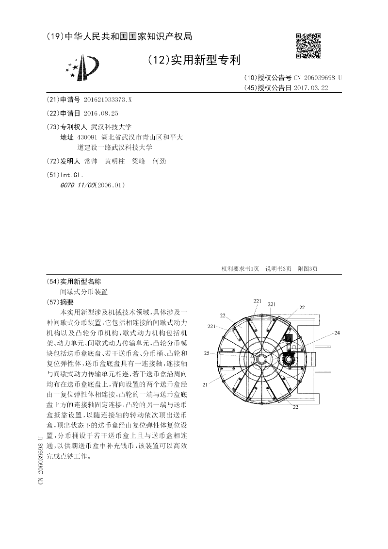 本实用新型涉及机械技术领域,具体涉及一种间歇式分币装置,它包括相连接的间歇式动力机构以及凸轮分币机构,歇式动力机构包括机架、动力单元、间歇式动力传输单元,凸轮分币模块包括送币盒底盘、若干送币盒、分币桶、凸轮和复位弹性体,送币盒底盘具有一连接轴,连接轴与间歇式动力传输单元相连,若干送币盒沿周向均布在送币盒底盘上,背向设置的两个送币盒经由一复位弹性体相连接,凸轮的一端与送币盒底盘上方的连接轴固定连接,凸轮的另一端与送币盒抵靠设置,以随连接轴的转动依次顶出送币盒,顶出状态下的送币盒经由复位弹性体复位设置,分币桶设于若干送币盒上且与送币盒相连通,以供朝送币盒中补充钱币,该装置可以高效完成点钞工作。
