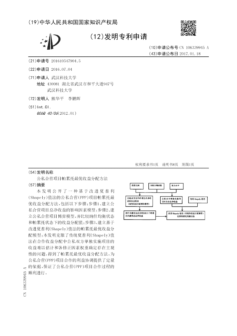 本发明公开了一种基于改进夏普利(Shapely)值法的公私合营(PPP)项目帕累托最优收益分配方法,包括以下步骤:步骤1、建立公私合营项目总净收益的影响因素模型;步骤2、建立公私合营项目博弈模型,并比较纳什均衡状态和帕累托状态下的收益分配值;步骤3、建立基于改进夏普利(Shapely)值法的帕累托最优收益分配模型;本发明克服了传统夏普利(Shapely)值法在合作收益分配中公私双方单独实施项目的收益难以估计和各修正因素权重确定存在主观性的问题,得到了帕累托最优收益分配方法,为公私合营(PPP)项目合作的利益协调提供了定量的依据,保证了公私合营(PPP)项目合作过程的顺利进行。