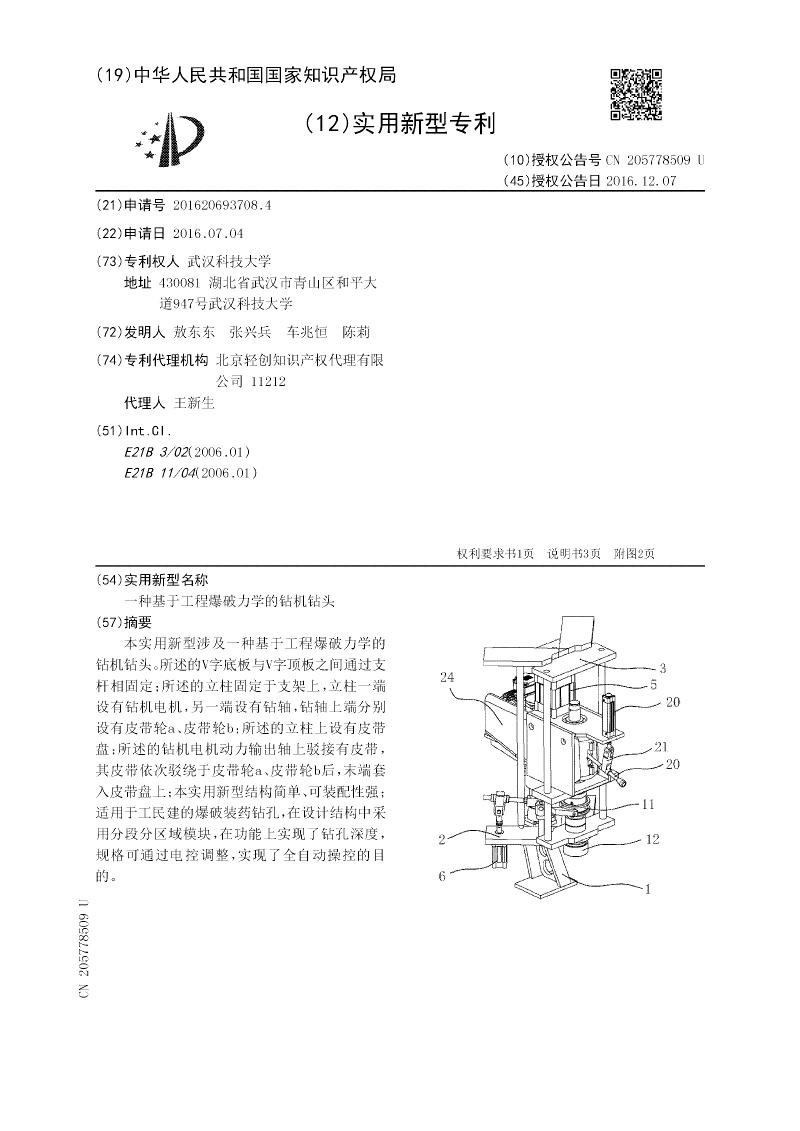 本实用新型涉及一种基于工程爆破力学的钻机钻头。所述的V字底板与V字顶板之间通过支杆相固定;所述的立柱固定于支架上,立柱一端设有钻机电机,另一端设有钻轴,钻轴上端分别设有皮带轮a、皮带轮b;所述的立柱上设有皮带盘;所述的钻机电机动力输出轴上驳接有皮带,其皮带依次驳绕于皮带轮a、皮带轮b后,末端套入皮带盘上;本实用新型结构简单、可装配性强;适用于工民建的爆破装药钻孔,在设计结构中采用分段分区域模块,在功能上实现了钻孔深度,规格可通过电控调整,实现了全自动操控的目的。