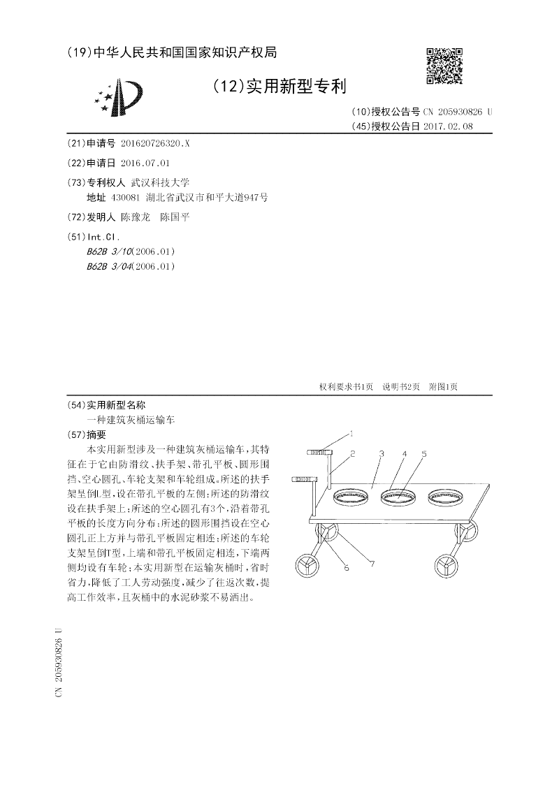 本实用新型涉及一种建筑灰桶运输车,其特征在于它由防滑纹、扶手架、带孔平板、圆形围挡、空心圆孔、车轮支架和车轮组成。所述的扶手架呈倒L型,设在带孔平板的左侧;所述的防滑纹设在扶手架上;所述的空心圆孔有3个,沿着带孔平板的长度方向分布;所述的圆形围挡设在空心圆孔正上方并与带孔平板固定相连;所述的车轮支架呈倒T型,上端和带孔平板固定相连,下端两侧均设有车轮;本实用新型在运输灰桶时,省时省力,降低了工人劳动强度,减少了往返次数,提高工作效率,且灰桶中的水泥砂浆不易洒出。