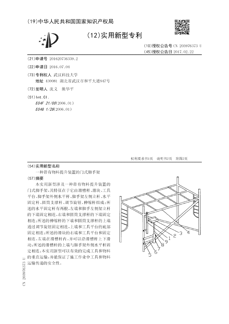 本实用新型涉及一种带有物料提升装置的门式脚手架,其特征在于它由滑槽杆、滑块、工具平台、脚手架外侧水平杆、脚手架左侧立杆、水平固定杆、圆筒支撑杆、调节旋钮、伸缩杆组成;所述的水平固定杆有两根,左端和脚手左侧架立杆的下端固定相连,右端和圆筒支撑杆的下端固定相连;所述的伸缩杆的下端和圆筒支撑杆的上端通过调节旋钮固定相连,上端和工具平台的底部固定相连;所述的滑块的右端和工具平台和固定相连,左端在滑槽杆内,并可以沿滑槽杆上下滑动;所述的滑槽杆的上端与脚手架外侧水平杆固定相连;本实用新型可以有效的完成工具和物料的垂直运输,并能保证了施工作业中工具和物料运输传递的安全性。